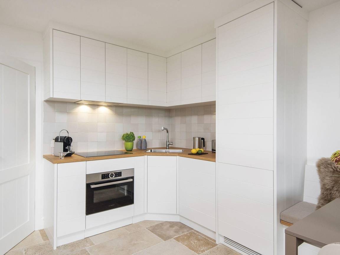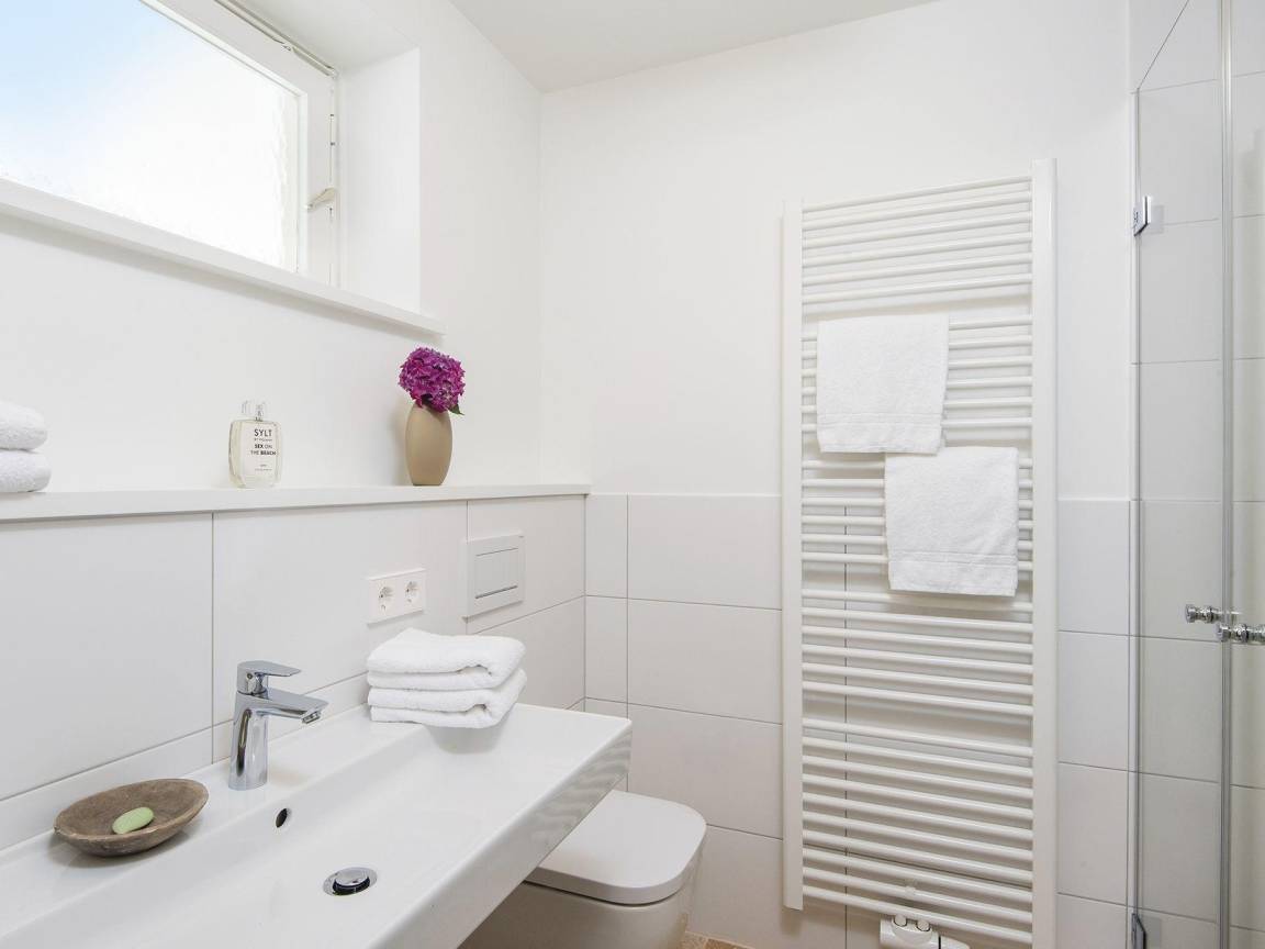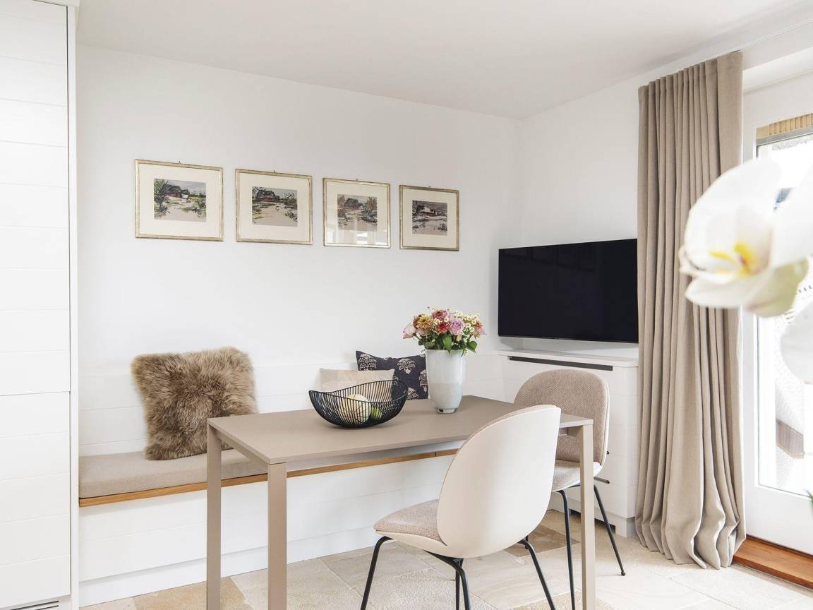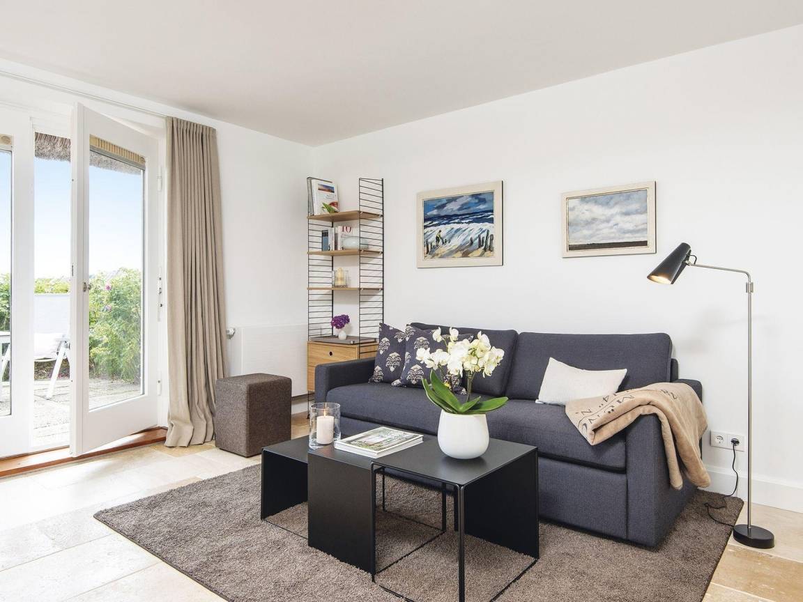Diese frisch renovierte Erdgeschosswohnung in einem gediegenen Appartementhaus unter Reet strahlt moderne Gemütlichkeit aus sobald man sie betritt. Zur Rechten erwartet Sie das hyggelige Alkovenbett für Zwei und zur Linken glänzt das hell gestaltete Bad mit ebenerdiger Dusche. Durch den kleinen Flur gelangen Sie nun ins WohnEsszimmer samt voll ausgetatter Küchenzeile über Eck und Zugang zur Terrasse mit weitem Blick gleich über beide Meere - an guten Tagen bis nach List. Die Essecke mit Sitzbank lädt zu geselliger Runde ein und in der Sofaecke lässt es sich herrlich in einem Buch schmökern. Das Quartier ist mit beigefarbenem Naturstein ausgelegt und insgesamt ganz in Weiß- und Naturtönen gehalten.