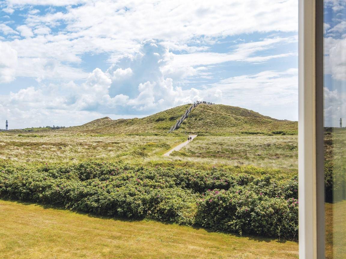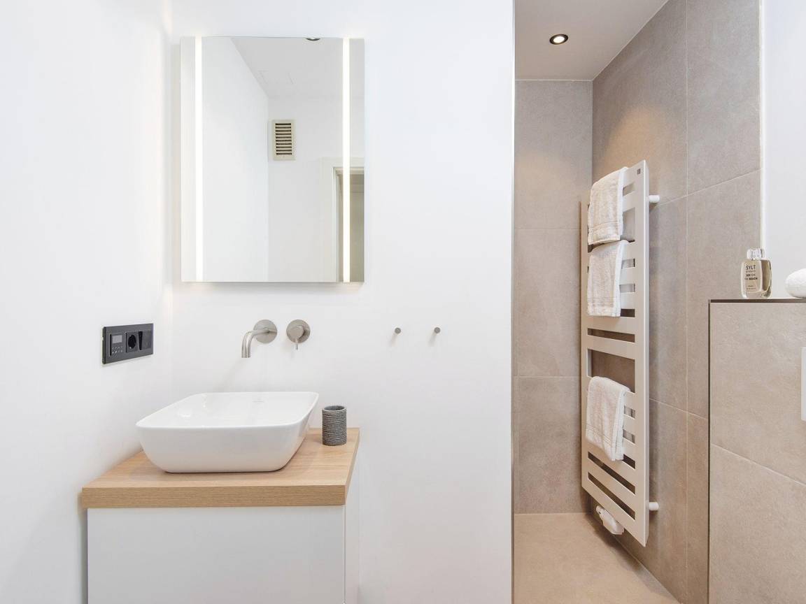Vom Flur aus gelangt man vorbei an einem modernen kleinen Bad mit ebenerdiger Dusche in den kombinierten WohnEssbereich. Gleich zwei Essecken, ein Doppelbett und eine Sofaecke für gemütliche Lesestunden bieten hier alles was das Herz begehrt. Es erwartet Sie außerdem eine separate und voll ausgestattete Küche in modernem graugrün. Das perfekte Quartier für Alleinreisende und Paare, in ruhiger Lage direkt auf der Düne.