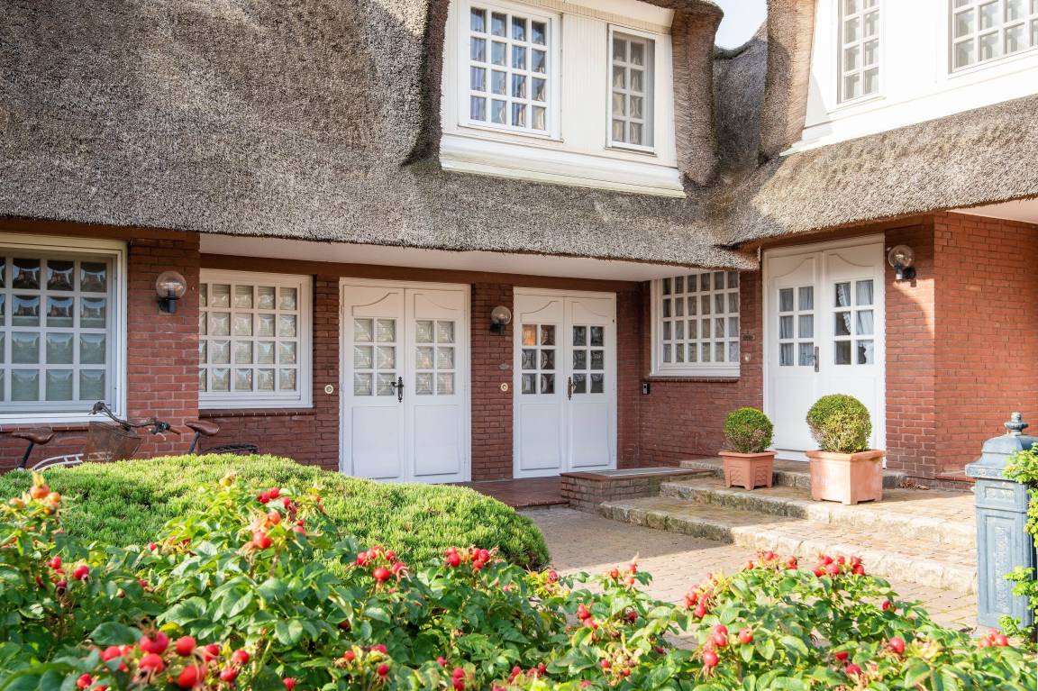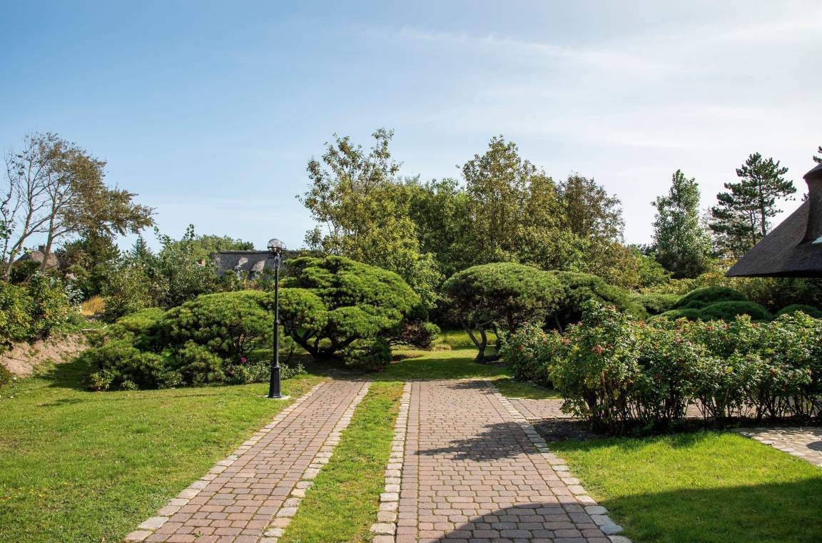 Wunderschöne Südterrasse mit Strandkorb und Teakholzgartenmöbeln. Sie haben Zugang zu einem großen von Sylt-Rosen umrankten Garten mit Rasen- und Heideflächen, Kiefern und einem Naturwall an der Außengrenze zur Straße. Zum Be- und Entladen der Koffer fahren Sie bequem über die Zufahrt bis vor die Wohnungstür. Zum Abstellen steht Ihnen ein Privatparkplatz direkt am Grundstück zur Verfügung.