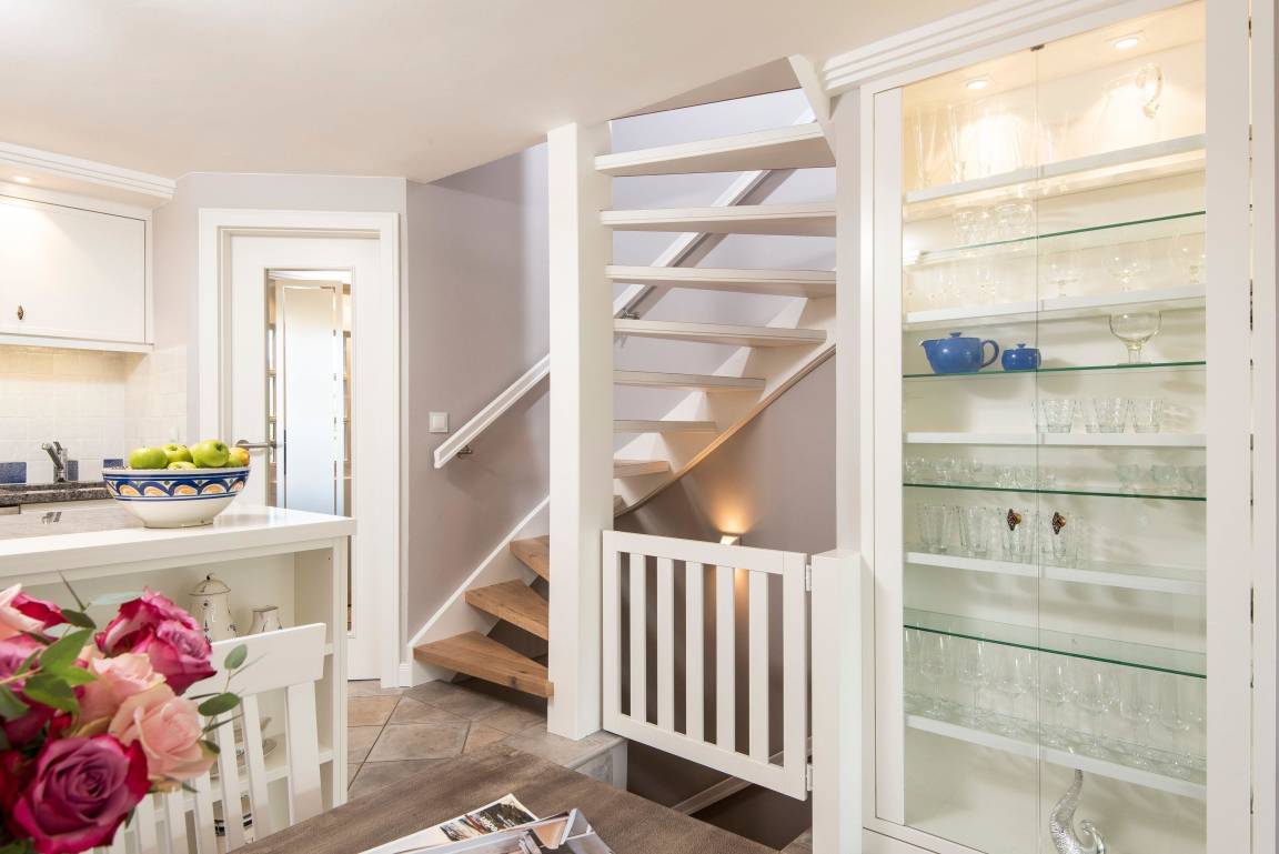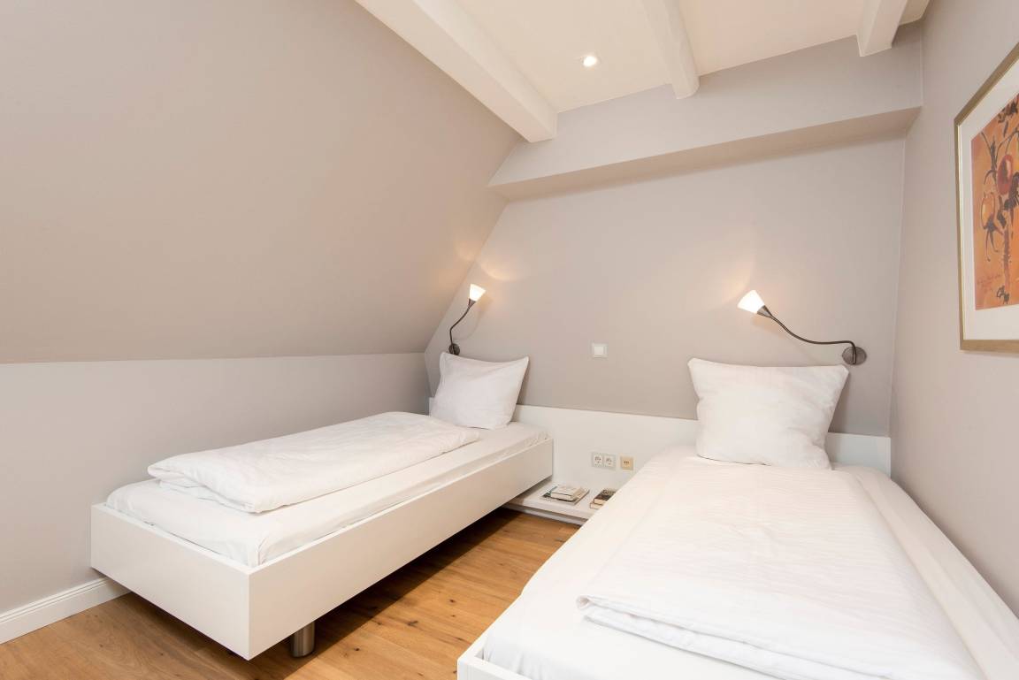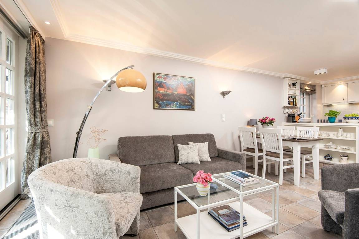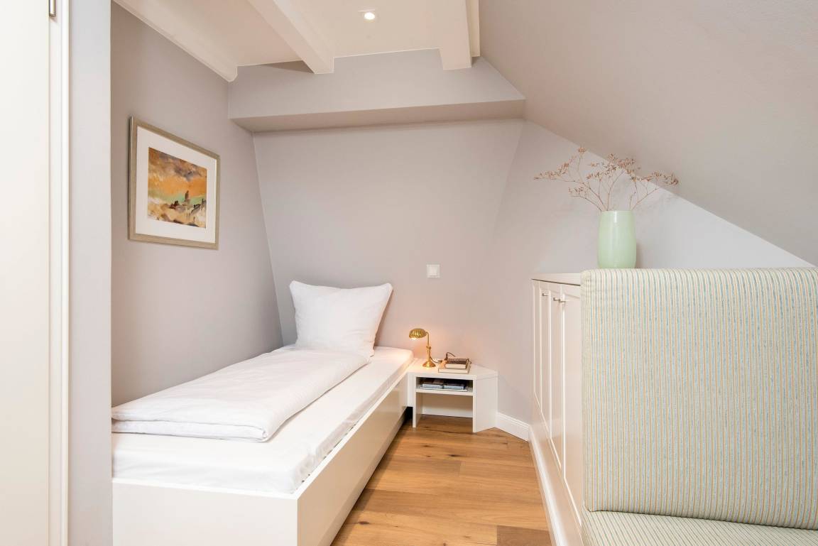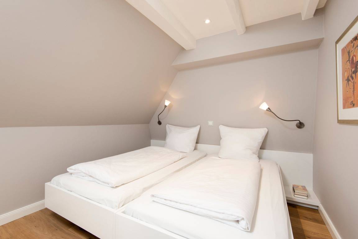 In hellen Farben begrüßt Sie ein großzügiger, moderner Wohnbereich mit offener Küche und einem Esstisch mit 5 Sitzplätzen. Vom bequemen Sofa und den gemütlichen Sesseln blicken Sie durch das große Fenster in den Garten mit Südterrasse, Gartenmöbeln und Strandkorb. Über eine offene Treppe erreichen Sie das OG mit Duschbad, einem Doppelschlafzimmer und einem Einzelzimmer. Das Doppelbett lässt sich auf Wunsch in 2 Einzelbetten trennen. Weiter geht es noch ein Stockwerk höher unter das Dach in ein Schlafzimmer mit zwei Einzelbetten und Dachfenster mit direktem Himmelsblick. Im befensterten Souterrain finden Sie eine Sauna mit Ruhebereich sowie ein weiteres Duschbad mit Regenschwallbrause und eingebautem Waschtrockner. Die Schlafzimmer und Treppen bis zum 1. OG haben Parkettböden, das Dachbodenzimmer ist mit Teppichboden ausgelegt. Der Wohnbereich, Küche, Diele und Bäder haben einen Natursteinboden mit Fußbodenheizung. Bettdecken und Kopfkissen sind allergikergeeignet.