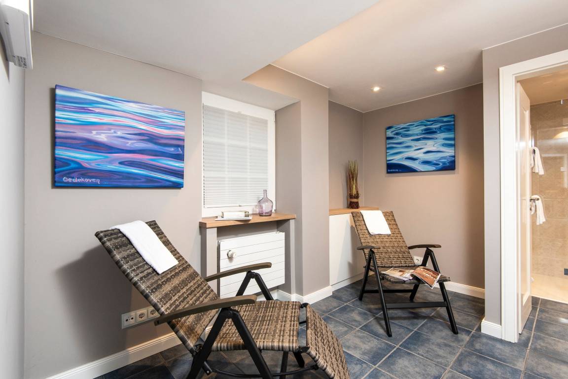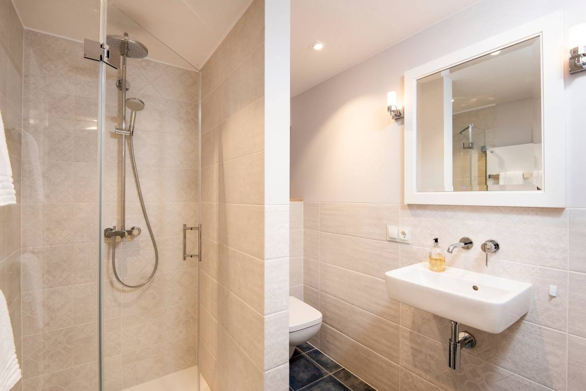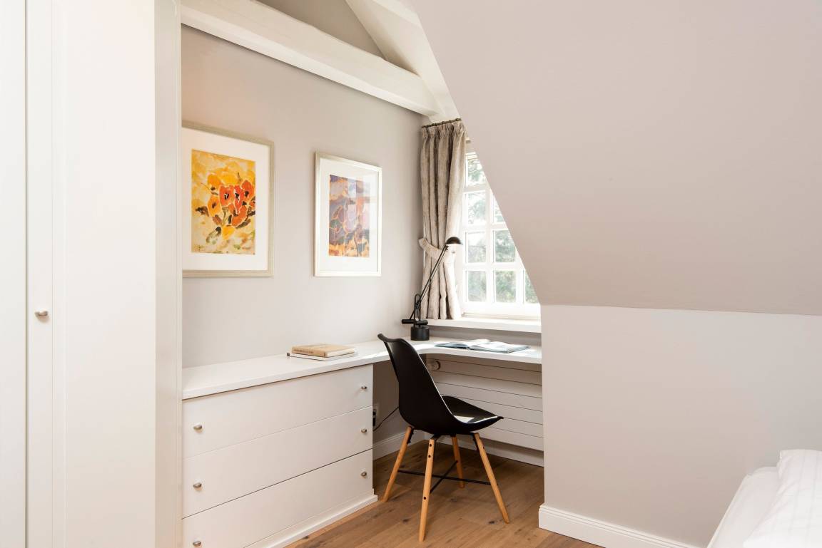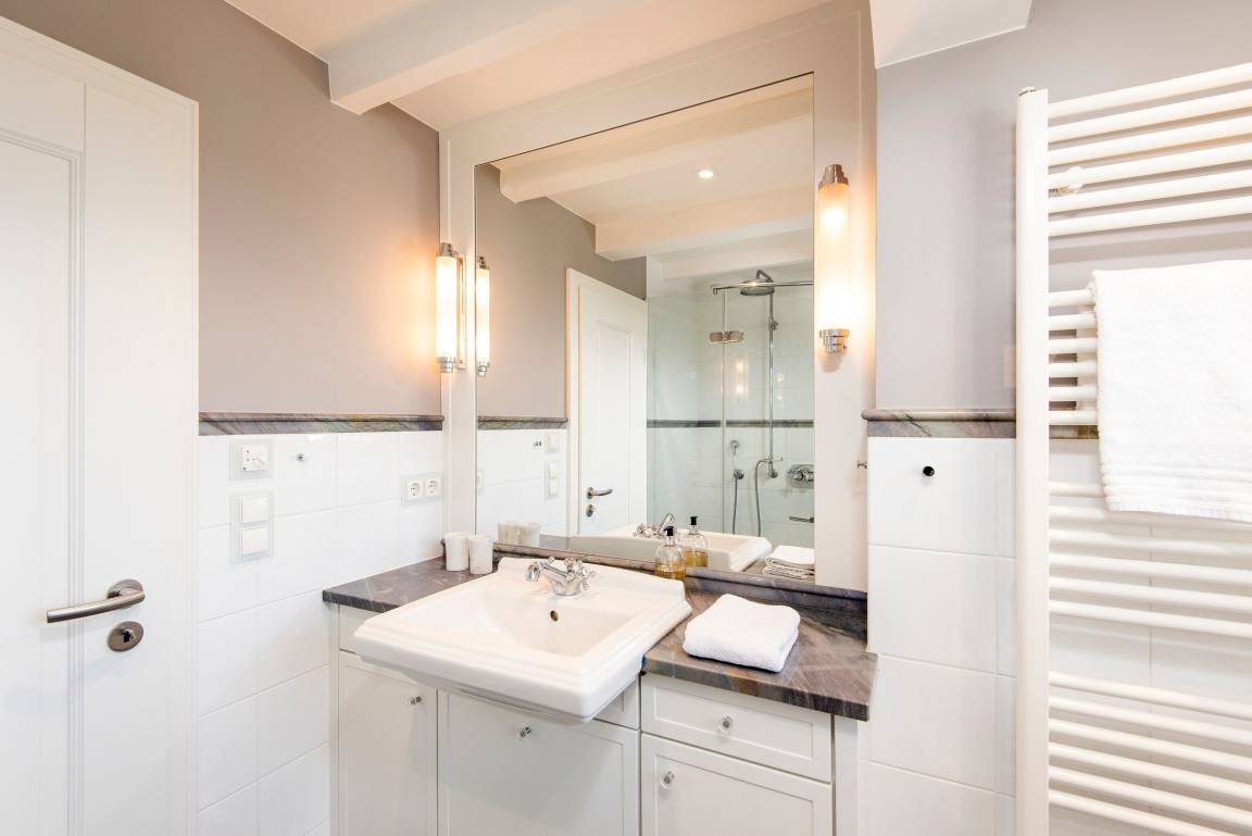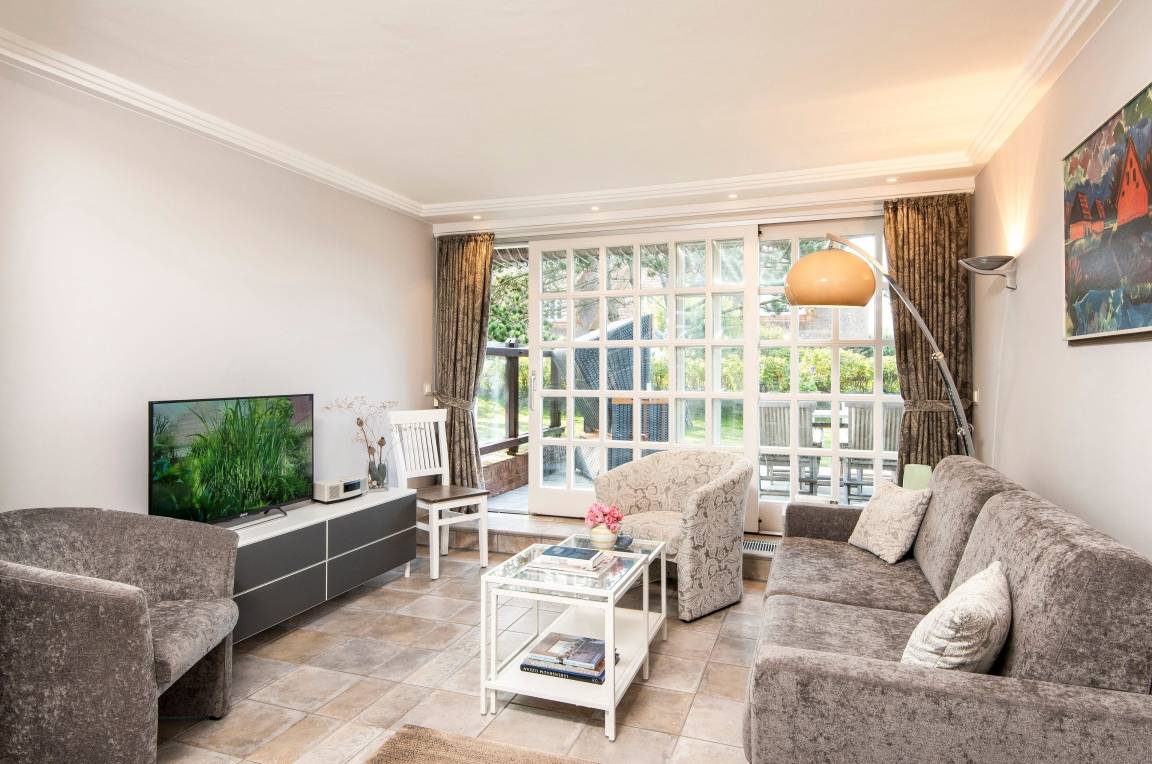In hellen Farben begrüßt Sie ein großzügiger, moderner Wohnbereich mit offener Küche und einem Esstisch mit 5 Sitzplätzen. Vom bequemen Sofa und den gemütlichen Sesseln blicken Sie durch das große Fenster in den Garten mit Südterrasse, Gartenmöbeln und Strandkorb. Über eine offene Treppe erreichen Sie das OG mit Duschbad, einem Doppelschlafzimmer und einem Einzelzimmer. Das Doppelbett lässt sich auf Wunsch in 2 Einzelbetten trennen. Weiter geht es noch ein Stockwerk höher unter das Dach in ein Schlafzimmer mit zwei Einzelbetten und Dachfenster mit direktem Himmelsblick. Im befensterten Souterrain finden Sie eine Sauna mit Ruhebereich sowie ein weiteres Duschbad mit Regenschwallbrause und eingebautem Waschtrockner. Die Schlafzimmer und Treppen bis zum 1. OG haben Parkettböden, das Dachbodenzimmer ist mit Teppichboden ausgelegt. Der Wohnbereich, Küche, Diele und Bäder haben einen Natursteinboden mit Fußbodenheizung. Bettdecken und Kopfkissen sind allergikergeeignet.