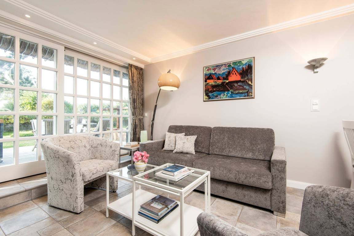 Inmitten eines großen Gartens und in Dünennähe liegt das charmante Reethausteil für bis zu 5 Personen. Die 100m² große Wohnung besticht durch moderne Eleganz und funktionalen Komfort. Nach außen ist die Anlage abgeschirmt von einem bepflanzten Naturwall.