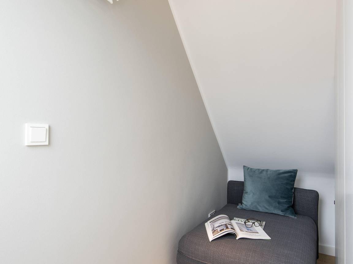 Die frisch renovierte Wohnung Kamphoog 14 befindet sich im ersten Obergeschoss eines Appartementhauses in der Kurhausstraße, unweit der legendären Sturmhaube. Vom Hausflur aus erreichen Sie das gemütliche Wohnzimmer mit der offenen Küche samt Essplatz am Bistrotisch. Ein Multifunktionsbackofen und auch ein Waschtrockner gehören hier zu den Vorzügen. Außerdem ist auf dieser Etage das elegant-moderne Duschbad untergebracht. Wer sich gern mal zu weit aus dem Fenster lehnt, kann hier seitlich sogar einen Blick auf beide Meere erhaschen. Im lichtdurchfluteten Obergeschoss erwartet Sie das behagliche Doppelschlafzimmer. Das Quartier ist mit hochwertigem Eichenparkettboden und Fliesen ausgelegt, farblich dominieren hier weiß und helle Naturtöne. Zu jeder Jahreszeit ein gediegen gemütliches Refugium für Zwei.
