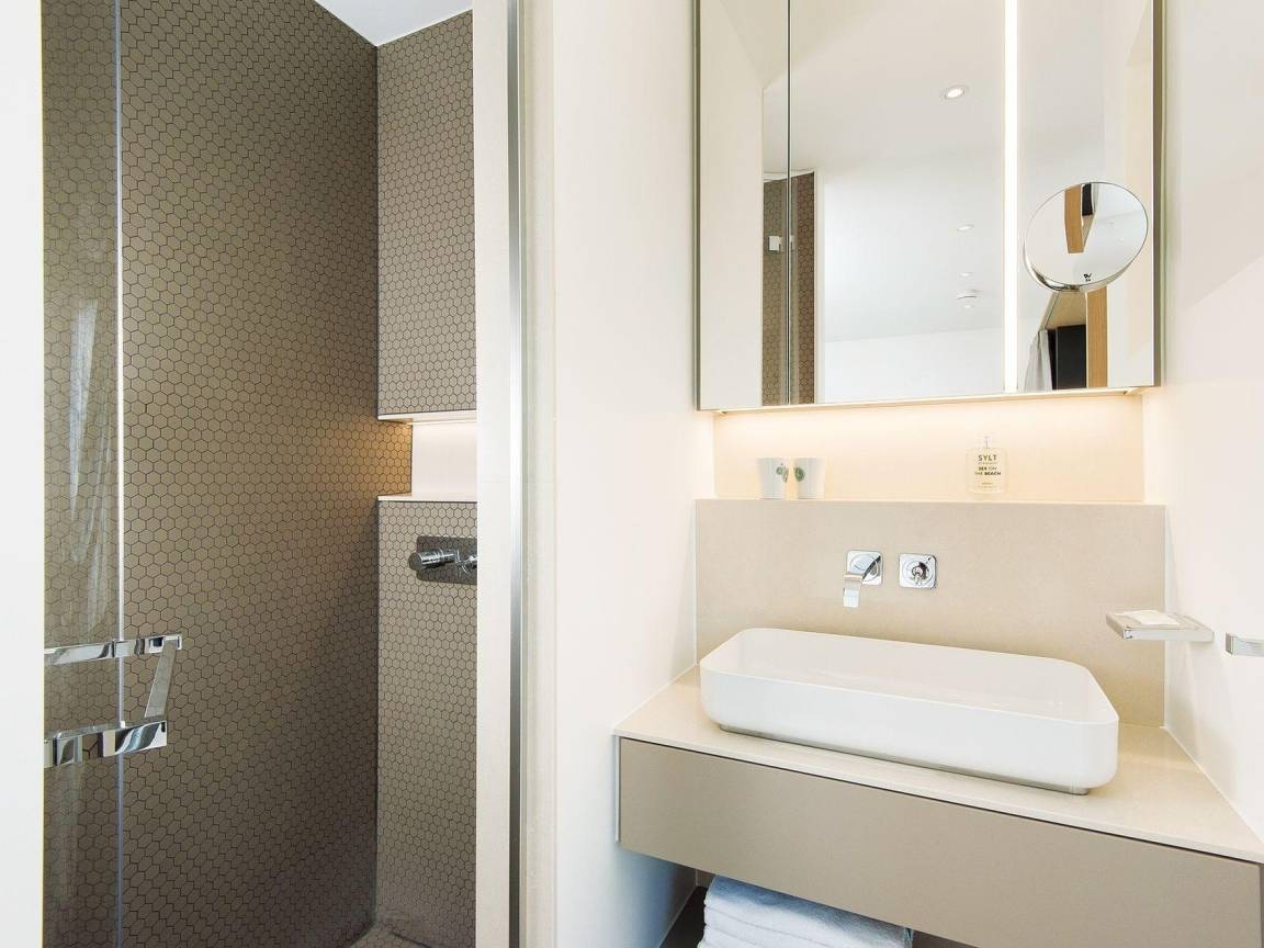 So geht „Schöner Wohnen" für zwei Personen. Eine Perle in der Kurhausstraße mit bezaubernder Lage - acht Minuten zu Fuß bis an den Strand und acht Minuten bis Kampen Mitte - der Blick über die Dünen bis zur legendären Uwe-Düne, dazu ein Stück Garten und eine eigene Terrasse. Die 60 m² Interieur dagegen erlebten ein rasantes Upgrade: Schwebetüren sorgen für elegante Abtrennungen und für eine großzügige Optik. Ess- und Loungebereich sind auf vier Personen ausgelegt und bieten sogar Platz für eventuelle Gäste unserer Gäste. Die Küchenzeile überzeugt Pragmatiker wie Ästheten. Die Dusche mit direktem Zugang vom Doppelschlafzimmer begeistert genauso wie das separate WC mit modernster Sanitärtechnik. Licht und Wärme werden über ein iPad im Flur gesteuert. Das K6 ist in jeder Hinsicht ein Traum - nicht zuletzt in Stilfragen. Mobiliar und Stoffe in Naturtönen mit eleganten Farbakzenten sorgen mit nordisch modernem Design für eine elegante Note.