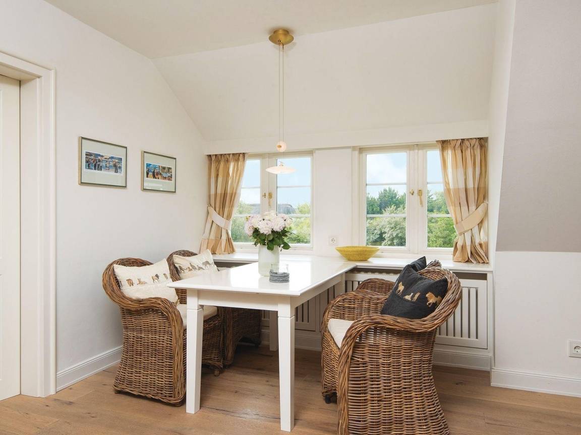 Entspannte Behaglichkeit in zentraler Lage: Die 2-Zimmerwohnung im ersten Stock eines modernen Ferienwohnhauses unter Reet liegt im Herzen des Ortes Kampen, ist aber dennoch alles andere als hektisch. Frische Brötchen und Lebensmittel gibt es im Haus nebenan. Restaurants, Boutiquen und Kampens gesellschaftliches Leben befinden sich direkt „um die Ecke". Das Wohn-Esszimmer mit seiner offenen Küche und das geschmackvolle Duschbad punktet durch sein Ambiente im modernen Landhausstil. Das helle Doppelschlafzimmer bietet einen Blick in die Idylle von Kampens Gärten.