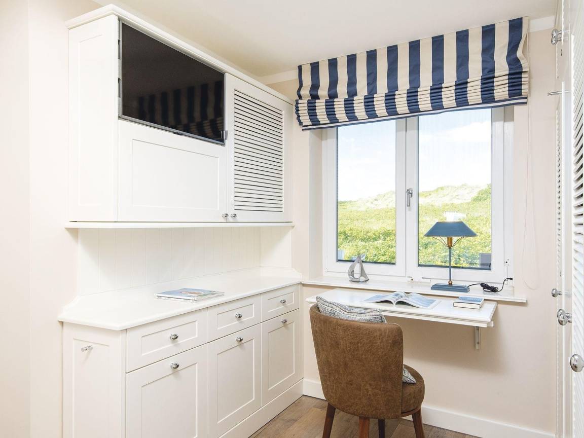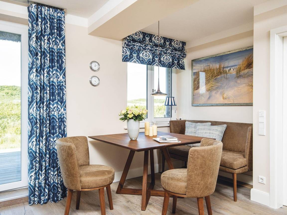 Traumhafte Lage auf dem Roten Kliff, umgeben von viel Grün mitten im Naturschutzgebiet. Diese Erdgeschosswohnung in einem gepflegten Appartementhaus unter Reet ist hochwertig und mit etwas maritimem Flair eingerichtet. Von dem kleinen Flur aus erreicht man durch die offene Küche mit Kochinsel das elegante Wohnzimmer. De Sede Ledermöbel, ein Wand-TV und ein toller Dünenblick über die Terrasse mit Strandkorb gen Westen sind hier die Vorzüge. Hinter der nächsten Tür erwartet Sie ein Doppelschlafzimmer mit Einbauschränken, TV und kleinem Arbeitsplatz vor dem Fenster, hier lockt der beruhigende Ausblick über Dünen und Sylter Heckenrosen. Ebenfalls vom Flur gehen auch das kleine Schlafzimmer mit Kojenbett, plus einem ausziehbaren Gästebett bzw. zusätzlichem Einzelbett für ein Kind und TV, sowie das elegante Bad mit Sitzdusche im XXL-Format ab. Das Quartier ist komplett mit Holzdielen und Natursteinböden ausgelegt.