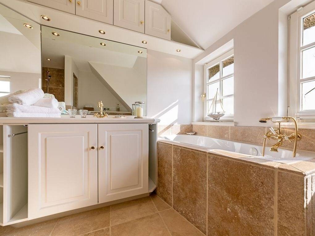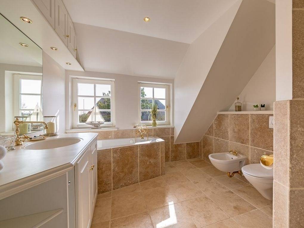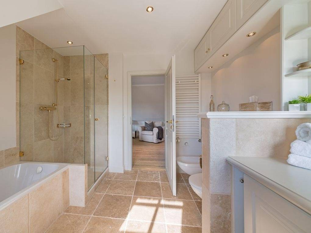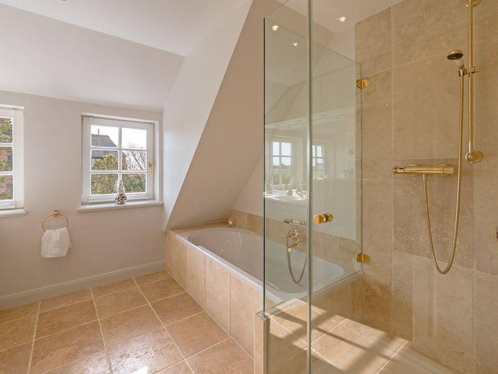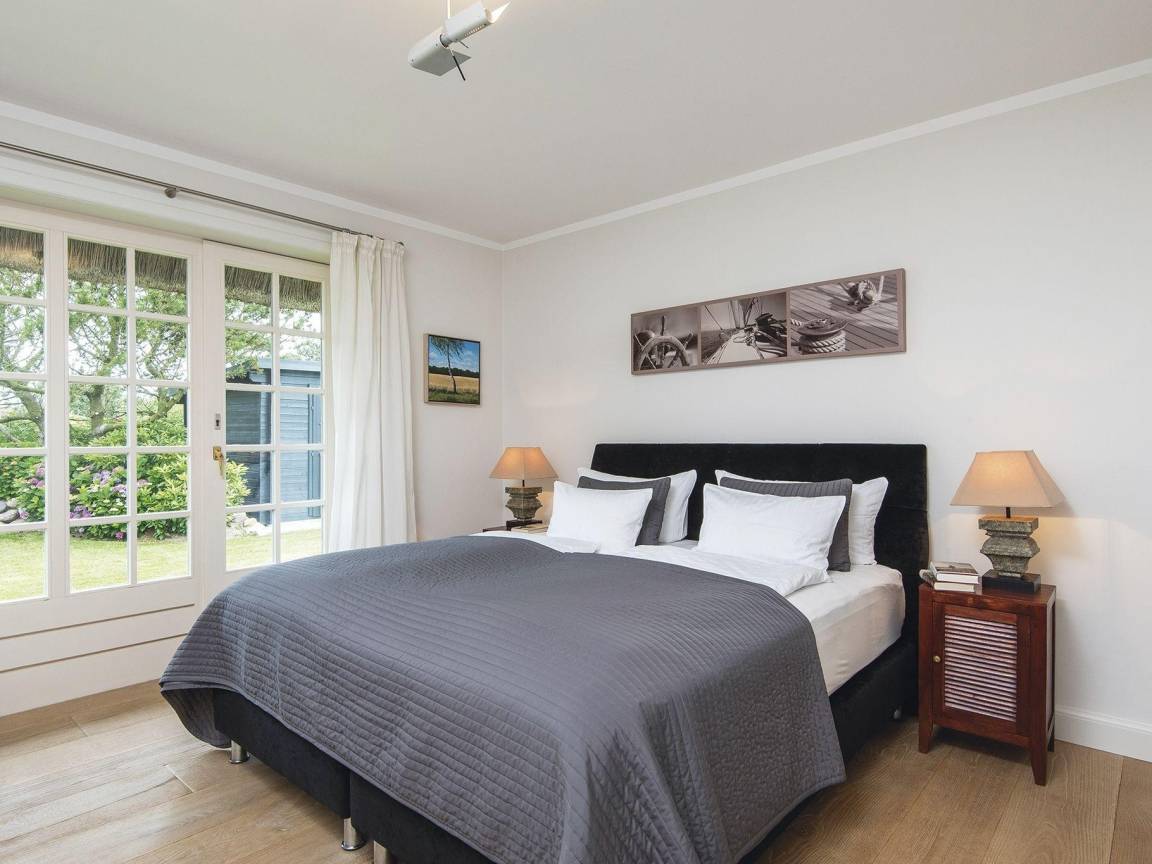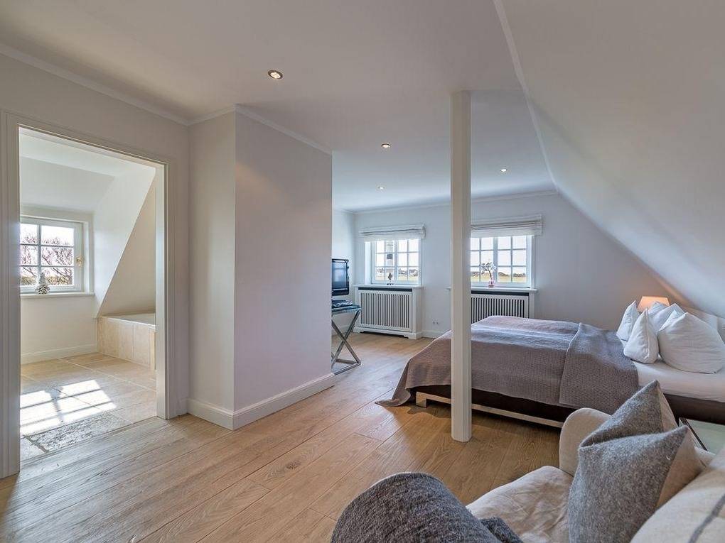 Schlichte Eleganz trifft Wohnlichkeit - hier erwartet Sie von allem nur das Beste. Durch das luftige Entrée erreichen Sie den lichtdurchfluteten und überaus großzügigen Wohn- und Essbereich. Bodentiefe Fensterfronten mit gleich zwei Terrassentüren ermöglichen den grandiosen Blick in den umzäunten Garten Richtung Süden über die Felder bis zum Kampener Leuchtturm "Langer Christian". Gleich zwei Tafeln für sechs bzw acht Personen, eine davon in der offenen voll ausgestatteten Küche, laden zu geselligen Runden ein. Außerdem sorgen ein Kachelofen und elegante Sofas nebst großem TV für den Gemütlichkeitsfaktor. Über einen kleinen Flur gelangen Sie zu den zwei schönen Doppelschlafzimmern im Erdgeschoss - eine Seltenheit in Kampen! Eines mit Schreibtisch und Terrassenaustritt nach Westen, beide mit geräumigen Einbauschränken, natürlich nebst ebenerdigem Duschbad. Im Obergeschoss fällt die Wahl schwer zwischen den zwei großzügigen Doppelschlafzimmern jeweils mit begehbarem Kleiderschrank und DuschWannenbad en suite, eines mit atemberaubenden Blick vorbei am Leuchtturm bis nach Wenningstedt, das andere erfreut das Auge mit den beschaulichen Reetdächern Kampens. Im Untergeschoss wird Wellness groß geschrieben. Eine Whirlwanne über Eck, eine gemauerte Dusche und die Sauna für bis zu Vier, sowie zwei Relaxliegen samt TV lassen keine Wünsche offen. Zudem befinden sich auf dieser Etage noch je ein Doppel- und ein Einzelschlafzimmer, sowie ein Duschbad. Ein großzügiges Quartier für Familien und alle mit Sinn für Schönes.