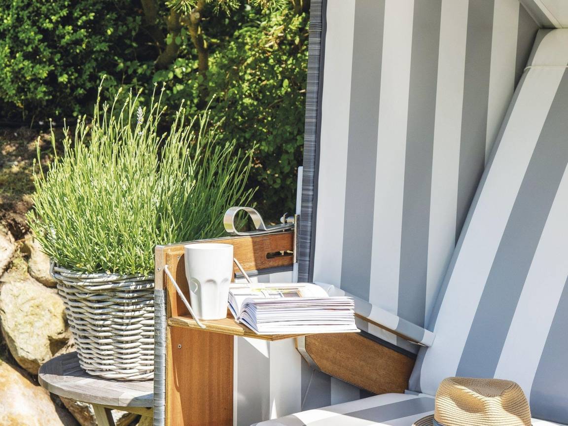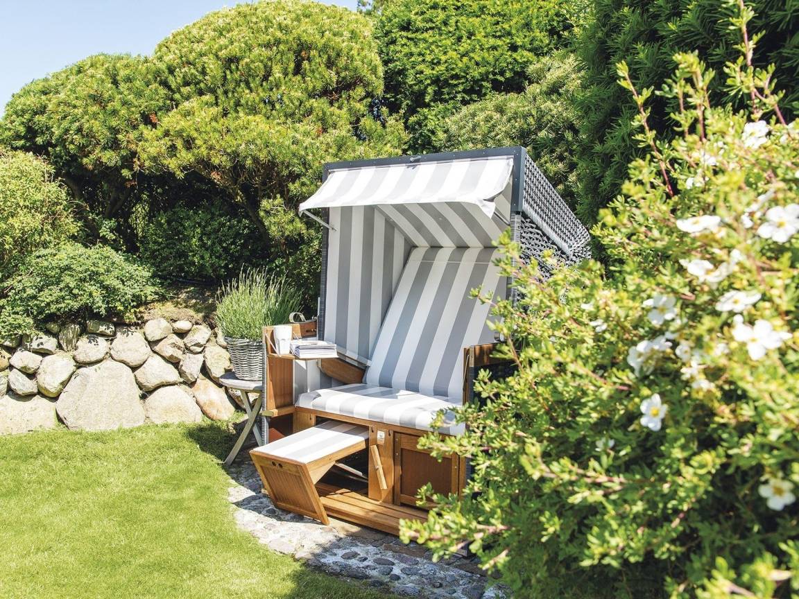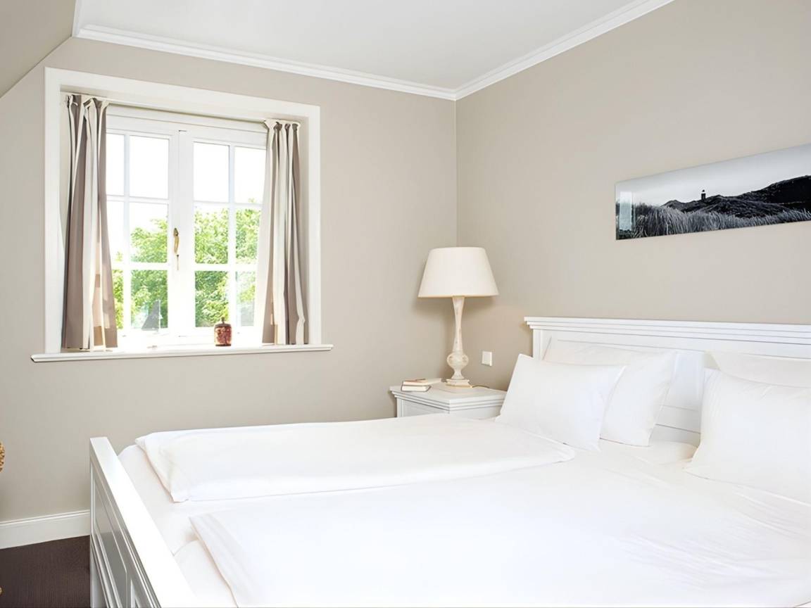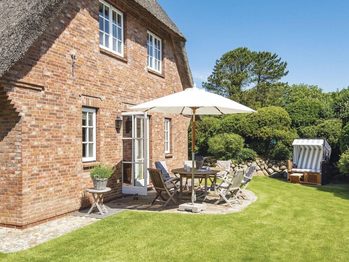 Bei der Ausstattung dieser Haushälfte wurde an nichts gespart: Die Holzeinbauten sind edel und im Sylter Stil. Im Erdgeschoss setzen die antiken Terracottaböden genauso einen Akzent wie die abgeschlossene hübsche Landhausküche in edlem Grau. Der Wohn-/Essbereich bietet viel Platz und wird gekrönt von einer Frühstücksterrasse nach Osten und einer Sonnenterrasse nach Süden. Im Obergeschoss erwarten Sie ein Doppelschlafzimmer mit WC en suite und ein Einzelschlafzimmer mit GrandLit, sowie ein separates Duschbad. Ganz besonders kuschelig ist die Schlafgelegenheit in der offenen Galerie des Spitzbodens. Das Untergeschoss ist über eine Treppe aus dem Wohnzimmer zu erreichen, neben einer Sauna-/Sanariumanlage mit kleiner Sitzecke befinden sich hier noch ein Weinkühlschrank, ein Doppelschlafzimmer mit Einbauschränken und ein Vollbad. Alle Schlafzimmer verfügen über einen TV. Ober- und Untergeschoss sind mit Sisalauslegeware ausgestattet.
