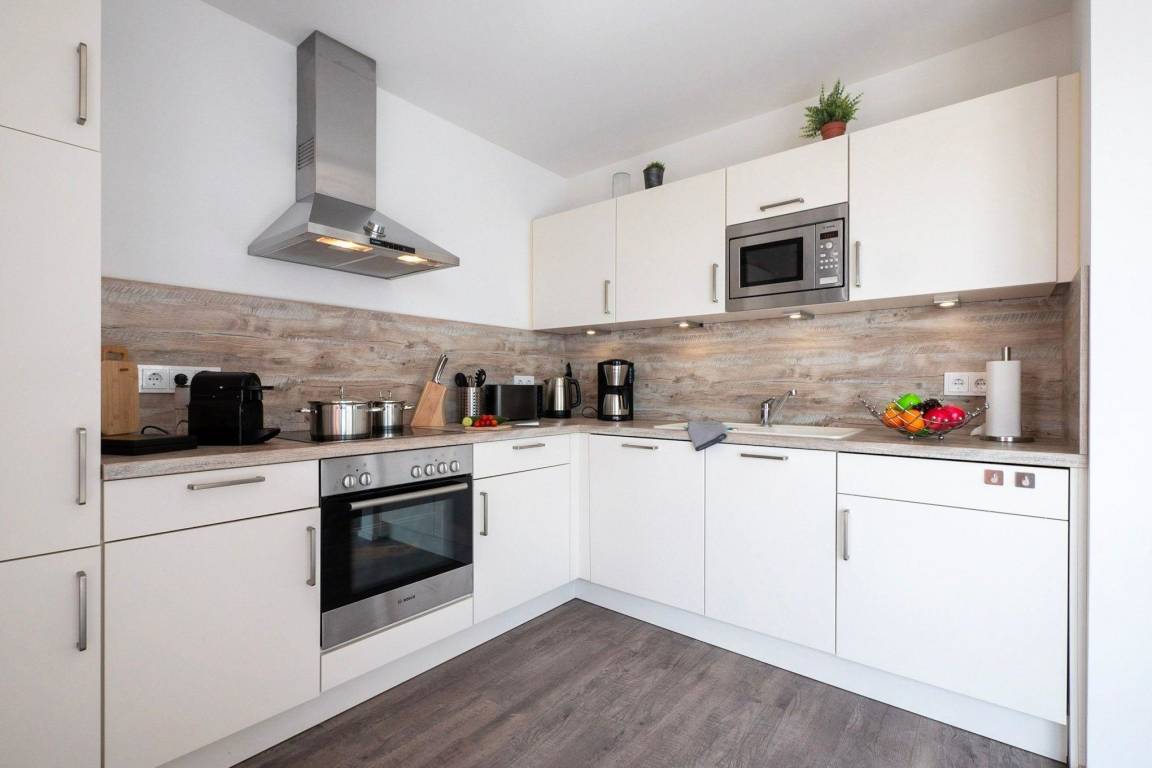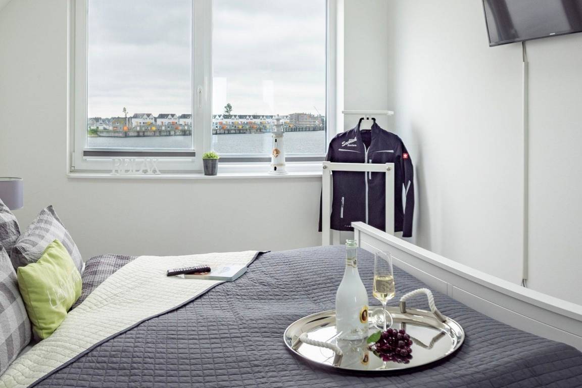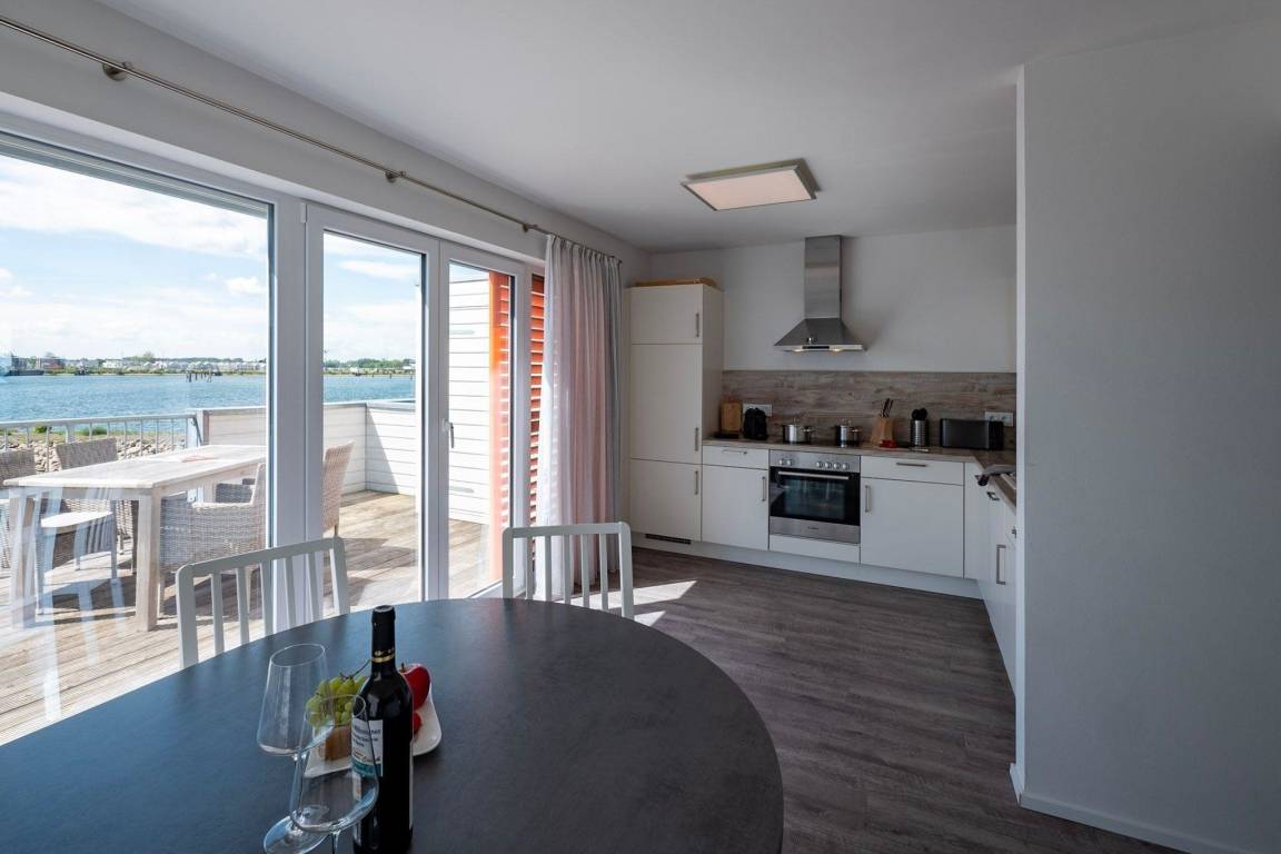 Im Fokus steht aber der perfekt umgesetzte lichtdurchflutete Wohn- und Essbereich mit Holz befeuertem Kaminofen, bodentiefen Panoramafenstern, welcher Loftartig gestaltet ist, sodass alle Räume fließend ineinander übergehen und sich der Wohnbereich mit der Natur verbindet. Die Integration der offenen Küche mit hervorragender Ausstattung und funktionalem Design, steht dem gemütlichen Beisammensein auch beim Zubereiten von allerlei Köstlichkeiten nichts im Wege. Die Wasserkulisse vor dem Essbereich mit 180 Grad Panoramablick auf den gesamten Hafen und die Ostsee ist hierbei zum Greifen nah – das ist Ostseeflair. Den zweiten Nordbalkon (ca. 8m²) betritt man über den Wohnbereich, hier können es sich unsere Gäste auf einer zusätzlichen Bestuhlung gemütlich machen und bei einem Sundowner mit Abendsonne den Tag ausklingen lassen.