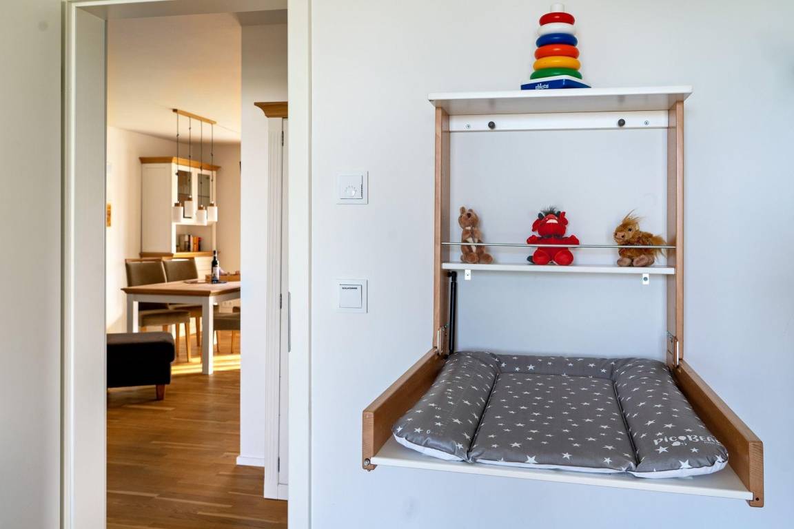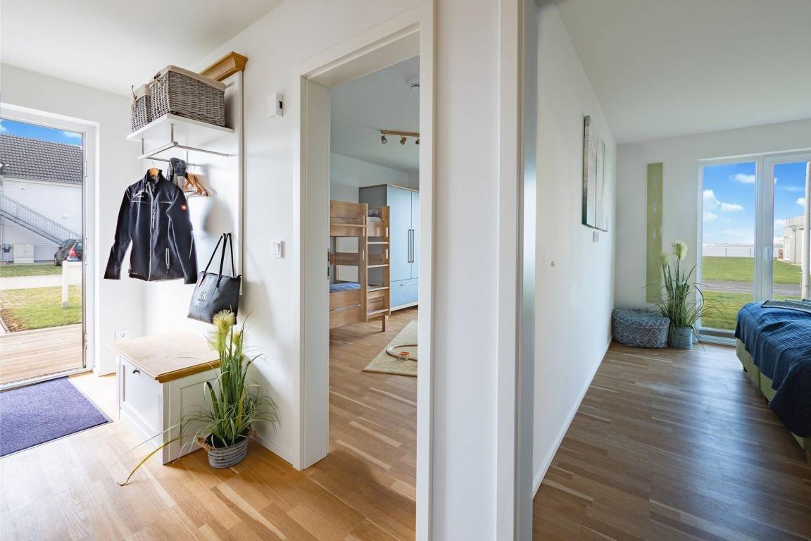 Die Ferienwohnung „MEERwert by Seeblick Ferien" in der Kapitänsstraße 50 bietet auf 77 m² eine familienfreundliche Unterkunft mit direktem Blick auf die Marina. Der Eingangsbereich führt zu einem stilvollen Badezimmer mit einer bodengleichen XXL-Dusche und einer Infrarotkabine mit Farblichttherapie. Zwei Schlafzimmer bieten Platz für bis zu vier Erwachsene, eines mit einem Boxspringbett und Smart TV, das andere mit einem hochwertigen Etagenbett. Der lichtdurchflutete Wohn- und Essbereich besticht durch einen Holz-Kaminofen und moderne Möbel. Die offene Küche ist komplett ausgestattet, inklusive Thermomix und Kindergeschirr. Für Kinder stehen Spiele, Spielzeug und ein Rausfallschutz zur Verfügung. WLAN, Smart TV und diverse Unterhaltungsmöglichkeiten sorgen für zusätzlichen Komfort. Ein Parkplatz und ein Fahrradschuppen sind ebenfalls vorhanden. Bitte beachten, dass die Strom- und Wasserkosten separat abgerechnet werden.