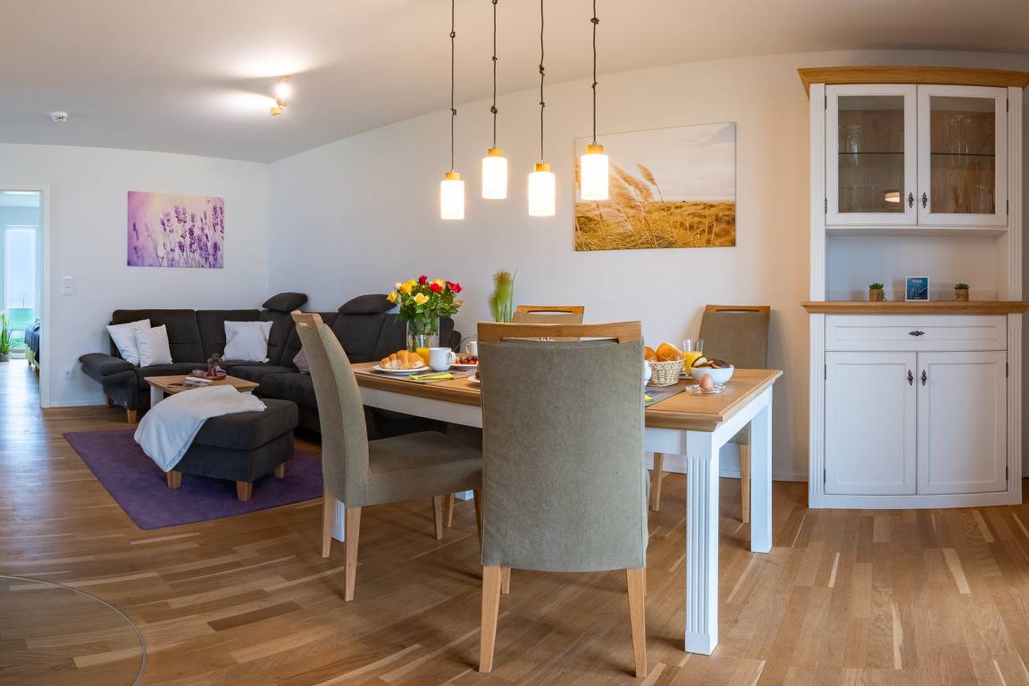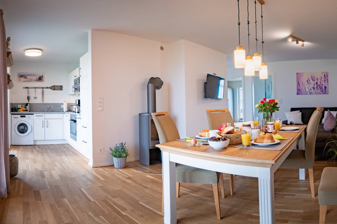 Die offene Küche mit hochwertiger Ausstattung lässt keine Wünsche offen, bis ins kleinste Detail liebevoll eingerichtet, liegt sogar ein Kindergeschirr bereit, am Esstisch lassen sich Urlaubsmahlzeiten genießen. Von hier aus fällt der Blick durch die bodentiefen Fenster auf die anliegende Terrasse, die Richtung Ostsee ausgerichtet ist und mit Südausrichtung traumhafte Sonnenstunden verspricht, frühstücken bei Morgensonne, ein Grillabend oder ein romantisches Candle Light Dinner, unvergessliche Urlaubsmomente sind hier garantiert.