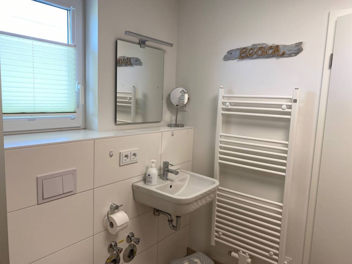 Der Eingangsbereich führt vorbei an einem schönen Badezimmer, dies lässt Wellnessherzen höher schlagen, denn es verfügt über eine Relax-Whirlwanne mit Dusche, über eine Sauna (Infrarotkabine) mit Farblichttherapie integriertem Hifi-Sound-System mit USB-Schnittstelle, hier darf zur eigenen Lieblingsmusik nach dem Strandspaziergang ausgeruht und geträumt werden.