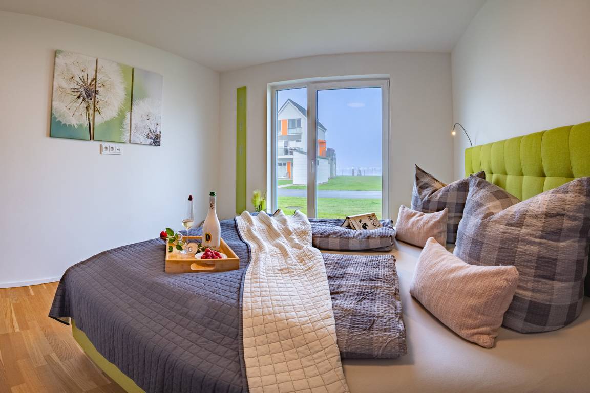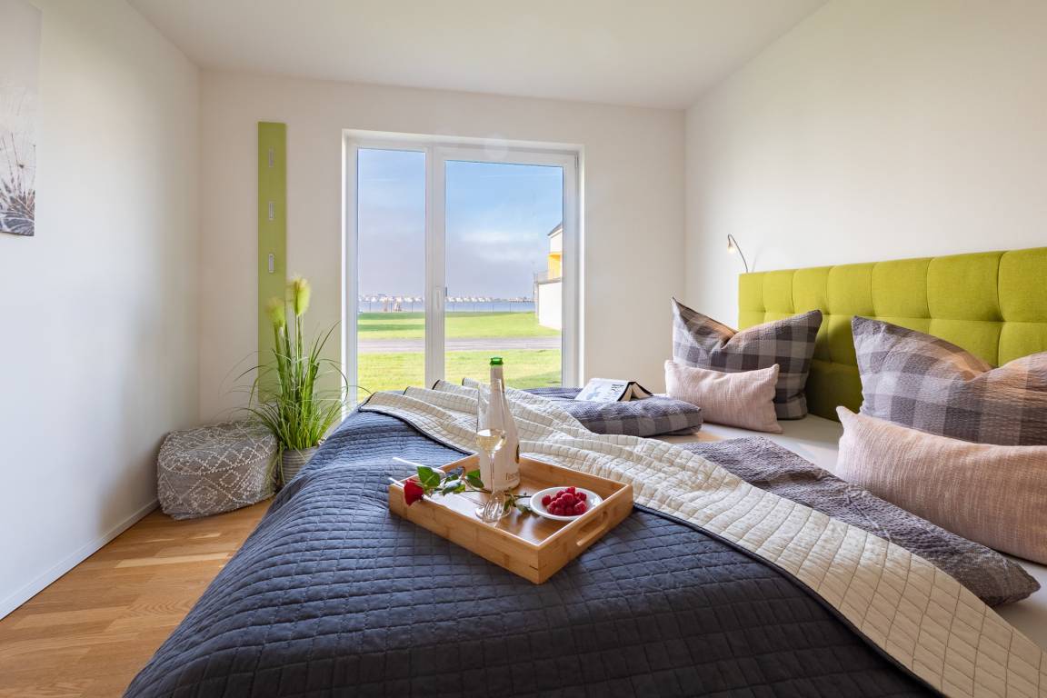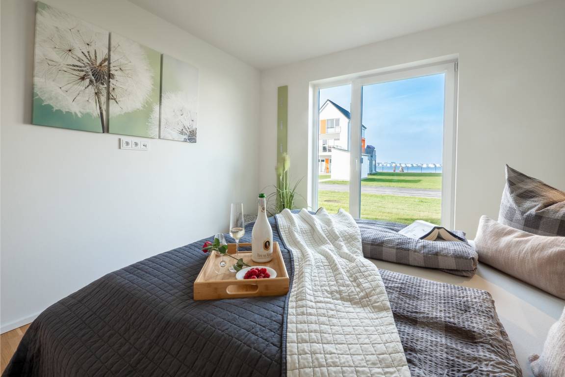 Auf der anderen Seite folgen zwei gut gestaltete Schlafzimmer mit Platz für maximal vier Erwachsene und einen traumhaften Blick auf's Wasser. Das Masterbedroom verfügt über ein Boxspringbett (1,80 x 2,00) mit zusätzlichem Smart TV, während ein hochwertiges Etagenbett (auch für Erwachsene 0,90 x 2,00) im zweiten Schlafzimmer auf Sie wartet. Im Fokus steht aber der perfekt umgesetzte lichtdurchflutete Wohn- und Essbereich mit Holz befeuertem Kaminofen, bodentiefen Fenstern, durch die sich der Wohnbereich mit der Natur verbindet. Moderne und hochwertige Möbel verleihen dem Herz der Wohnung Charme und Gemütlichkeit.