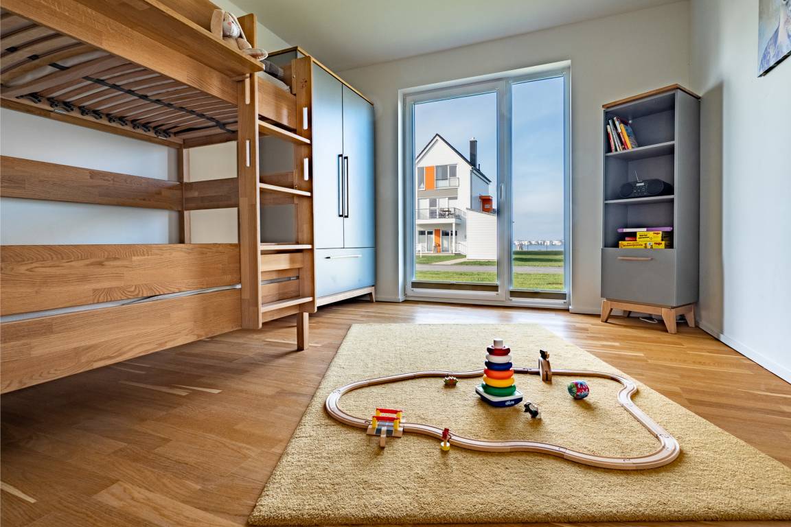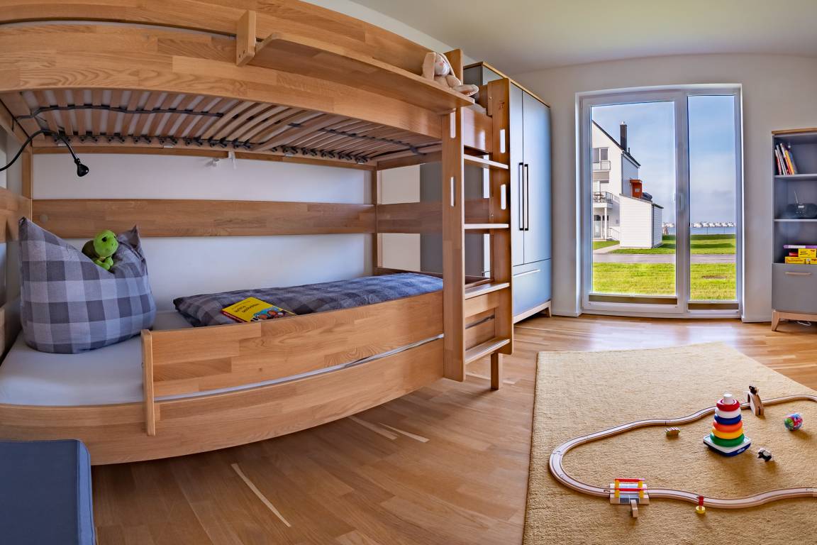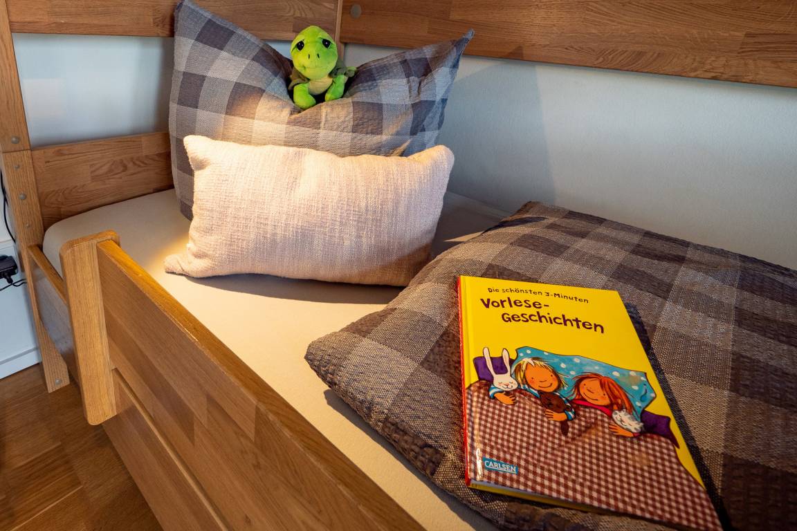 Auch an die Lütten wird gedacht: Für Indoor Unterhaltung sorgen verschiedene Spiele, Kinderbücher und Spielsachen, sowie eine kleine Holzeisenbahn. Zusätzlich lädt ein CD Spieler zum Hörbuchhören ein und über das internetfähige Radio, kann dem Lieblingssender gelauscht werden. Zudem ist das zweite Schlafzimmer mit einem Nachtlicht ausgestattet. Auch ein Rausfallschutz für das Etagenbett ist vorhanden. Steckdosensicherungen, Kinderhochstuhl, Babybett und sogar ein Tritthocker finden sich in der umfangreichen Ausstattung. Ein Wickeltisch ist in dieser Wohnung selbstverständlich.