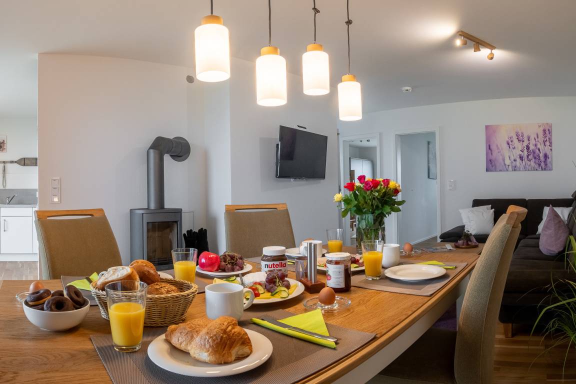 Der Kaminofen mit seinem knisterndem Feuer und die Fußbodenheizung verwandeln in diesem gemütlichen Ambiente selbst nordische Schietwettertage in heimelige Kuschelstunden. WLAN über Glasfaseranschluss und Smart TV mit Telekom Home Entertainment Programm sorgen ebenfalls für Indoor-Unterhaltung.