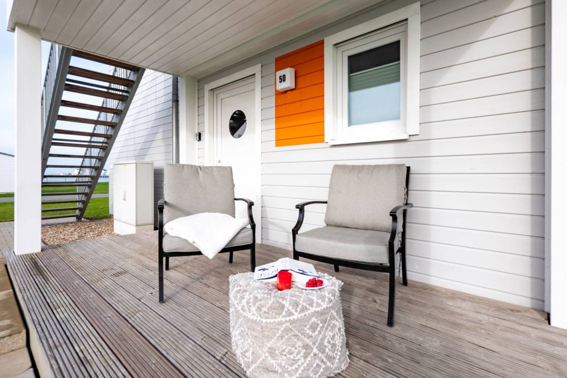 Zwei überdachte Sonnenterrassen Süd- und Westausrichtung mit direktem Zugang in den Garten und die liebevollen Details in der Ausstattung, versprechen Genuss von Sonnenauf- und untergang, während die Grünfläche um das Haus zum Sonnenbaden, Spielen und Verweilen einlädt. Der Hafenblick mit traumhaften Sonnenuntergängen bietet echten MEERwert.