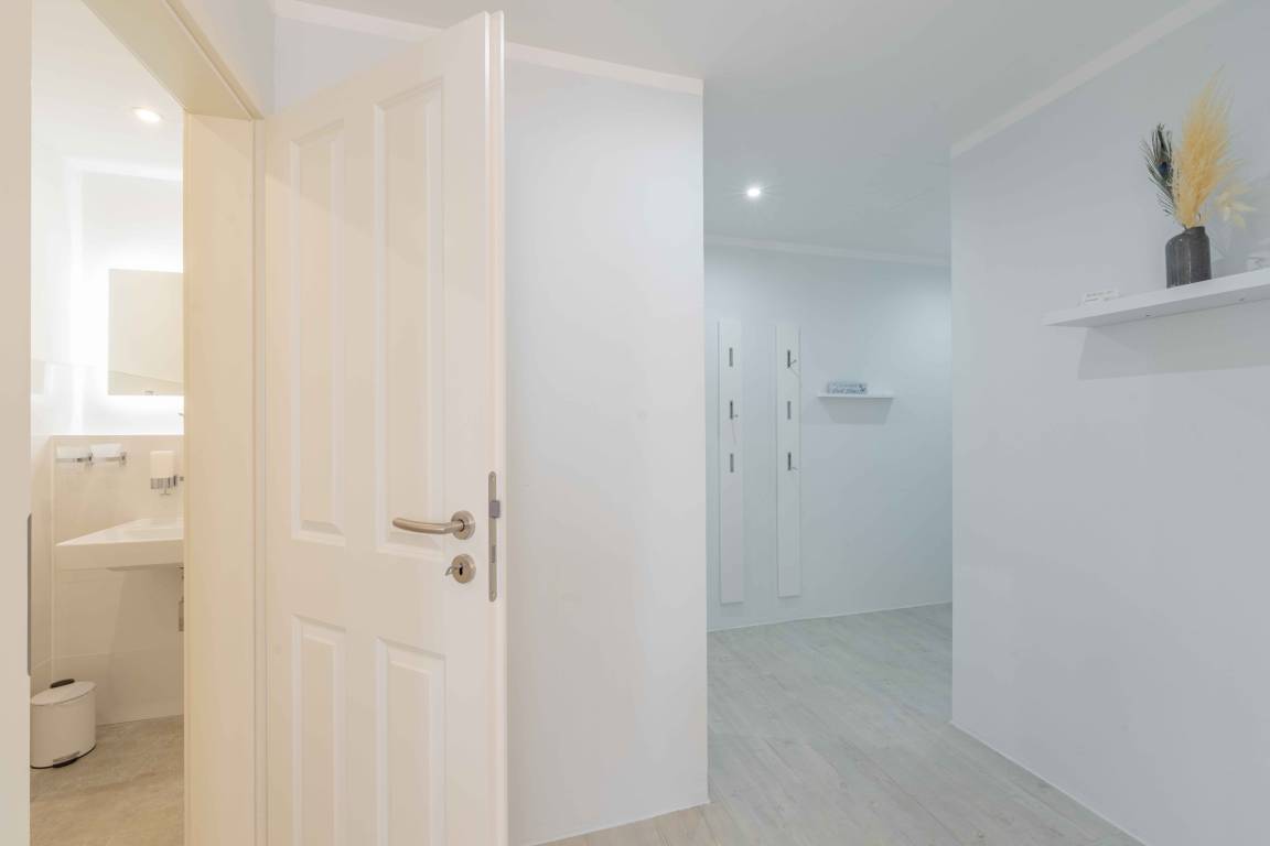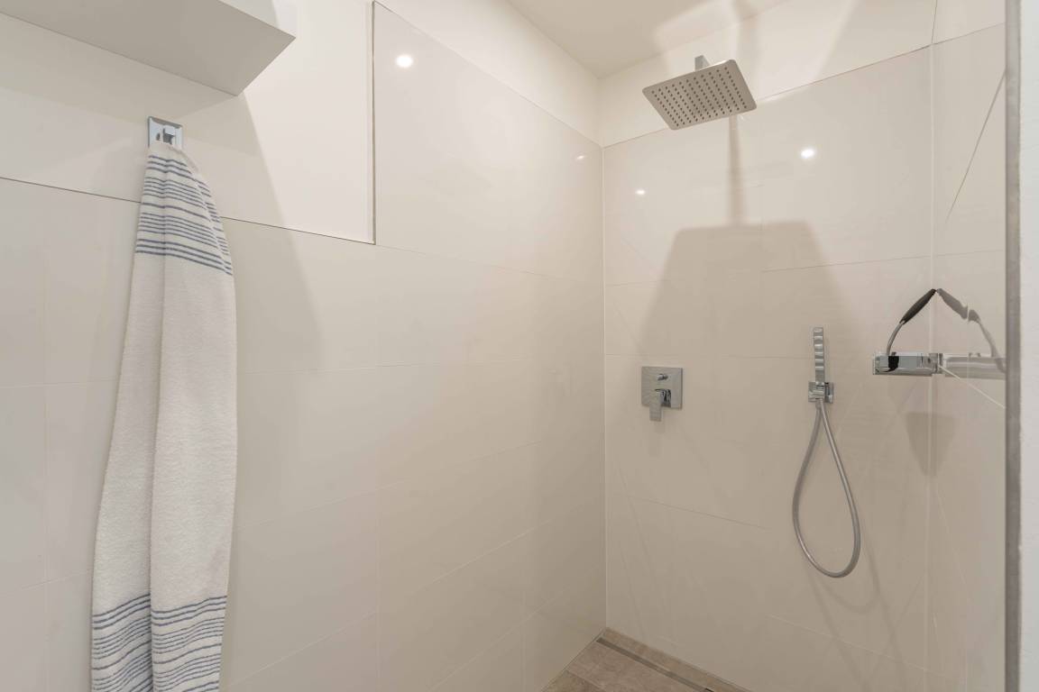 Das Bad besteht aus einer übergroßen bodentiefen / begehbaren Dusche mit Kopf- und Handbrause, WC, Waschtisch, Handtuchhaltern, Handtuchheizung und Bademänteln sowie einem Fön.