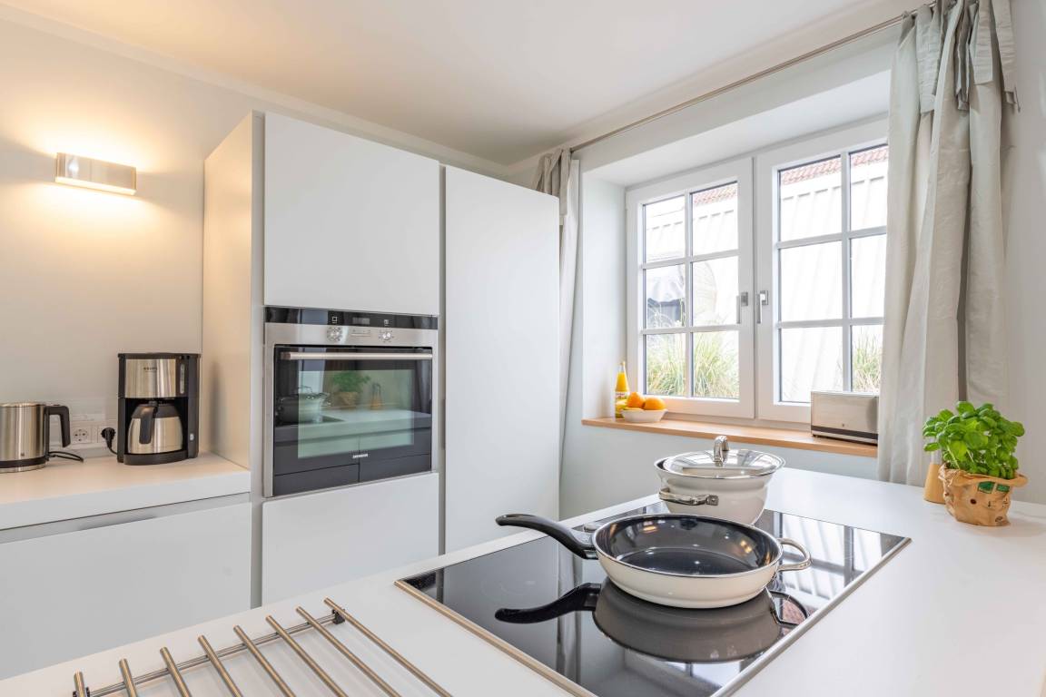 Die Küche der Luxusmarke Bulthaup besteht aus einer Küchenzeile, in der sich Spüle, Geschirrspülmaschine sowie der Kühlschrank mit Fresh-Funktion und der Multifunktionsofen befinden. Die Insel bietet ein Induktionsfeld und über Soft-Close-Schubladen jede Menge Stauraum. Sämtliche Geräte sind von hochwertigen Markenherstellern wie Miele, Siemens oder NEFF. Kaffeemaschine, Wasserkocher plus Toaster machen die Küche komplett.
