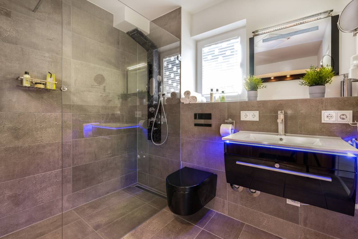 Bei dieser Ferienwohnung sind spektakuläre Sonnenlichtspiele durch die zwei Balkone in Süd- und Westausrichtung zu erwarten. Der Einrichtungsstil entspricht der exklusiven Lage der Ferienwohnung: Klare Farben und Formen, sowie der Einsatz natürlicher Materialien, versprechen Ruhe und Rückzug, während einzelne Farbakzente für erfrischende Leichtigkeit sorgen. Die gesamte Ferienwohnung lässt sich über die Fußbodenheizung einfach temperieren und bietet dank des Kaminofens und der Sauna das ganze Jahr über eine angenehme Wärme und eine gemütlich-wohlige Atmosphäre. Für Unterhaltung sorgen im Wohnbereich ein 42 Zoll Ultra HD Smart TV, Musik-Anlage mit WLAN und Bluetooth-Empfänger, Bücher sowie eine Spielesammlung. Darüber hinaus verfügt die Wohnung über einen kostenlosen Pkw-Stellplatz mit E-Ladesäule, für ein Elektroauto direkt am Haus.