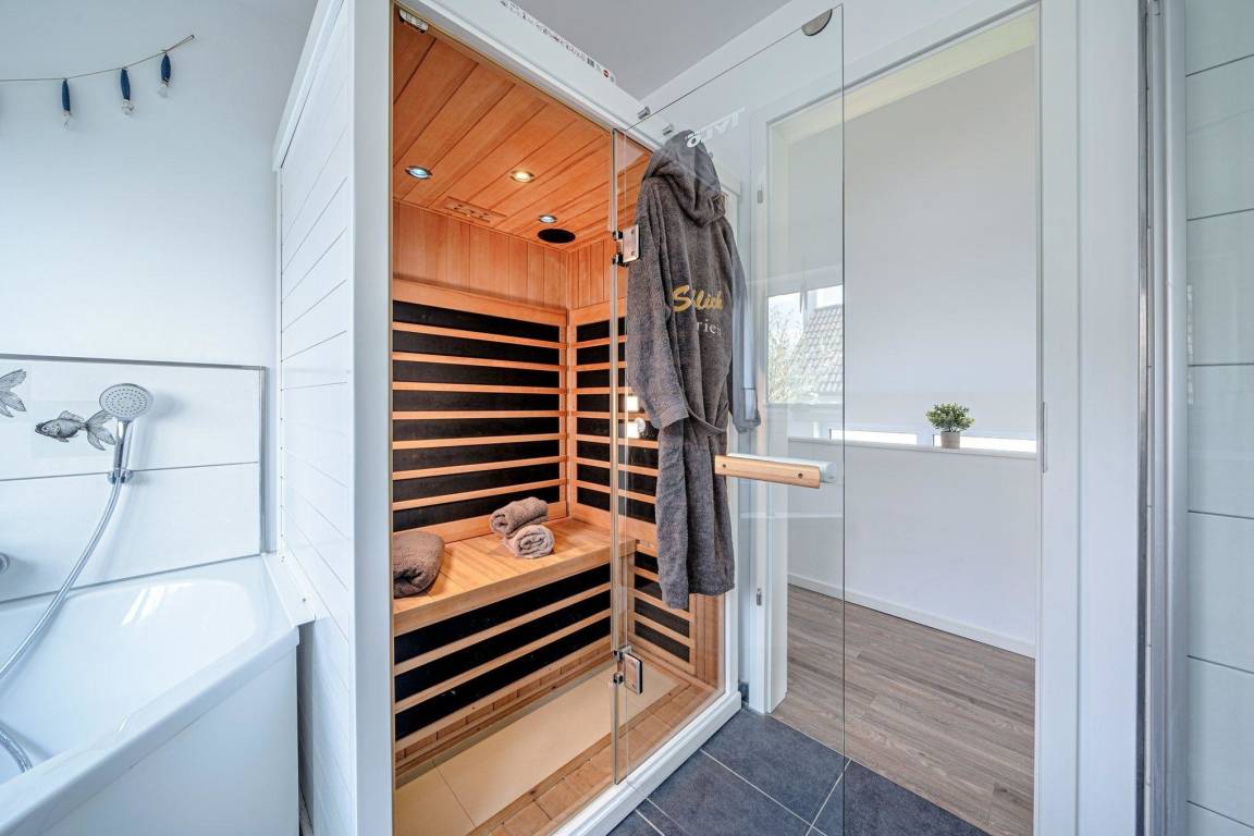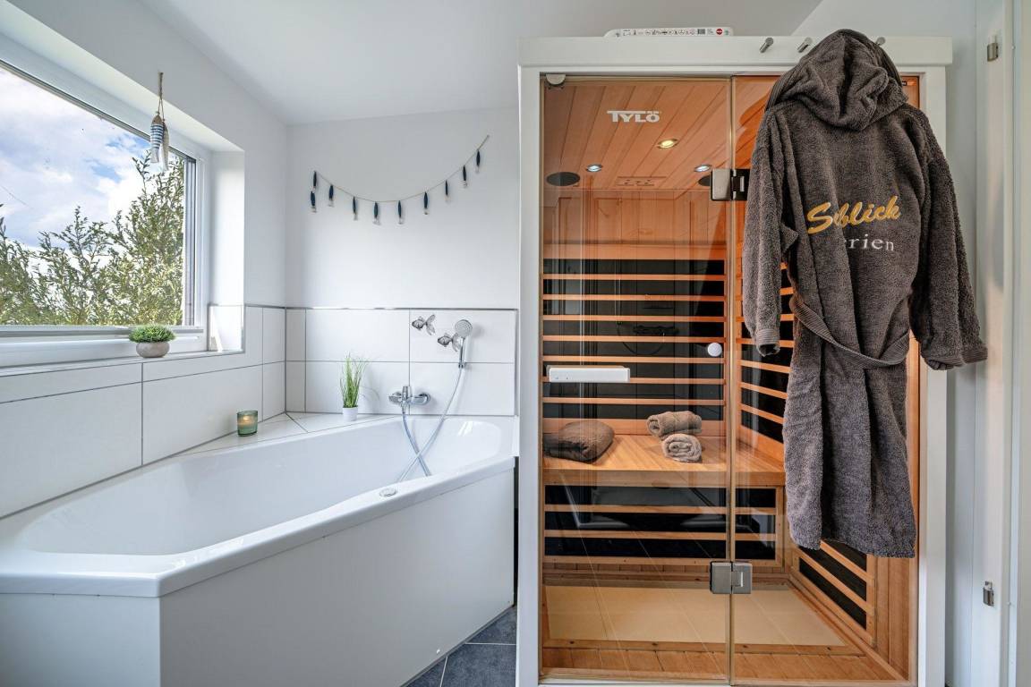Das exklusive Ferienhaus "An der Ostsee by Seeblick Ferien ORO" bietet eine moderne und luxuriöse Ausstattung. Im offenen Wohnbereich im Erdgeschoss können die Gäste den Blick auf das Hafenbecken genießen, entspannen am Kamin und gemeinsame Mahlzeiten einnehmen. Die hochwertig ausgestattete Küche verfügt über eine Nespressomaschine und einen extra Gefrierschrank. Im ersten Obergeschoss befindet sich ein stilvoller Ruhebereich mit Meerblick, einem Hauptschlafzimmer mit Smart TV und einem komfortablen Boxspringbett sowie einem zweiten Schlafzimmer mit zwei Einzelbetten und einem bereitstehenden Babybett. Zusätzlich stehen zwei Badezimmer zur Verfügung, eines mit Whirpoolbadewanne und Infrarot-Sauna. Der Einrichtungsstil kombiniert moderne Eleganz mit maritimem Flair. Gemeinschaftliche Annehmlichkeiten wie E-Ladesäulen und ein Fahrradschuppen runden das Angebot ab.