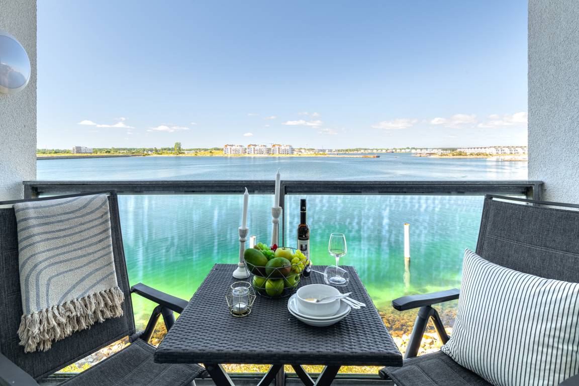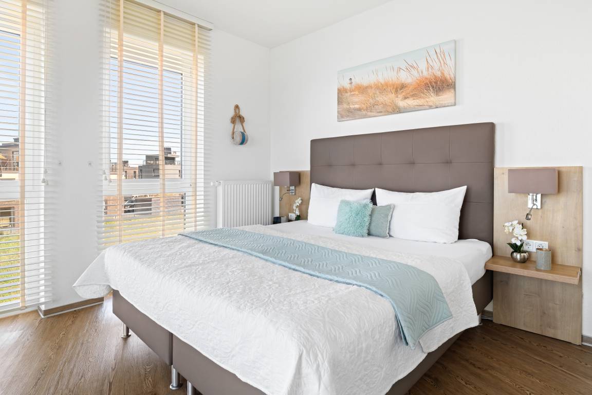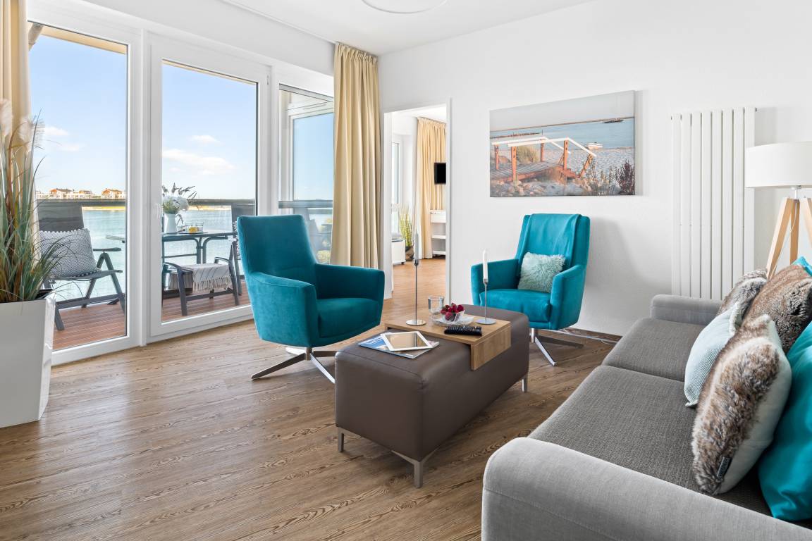 Sie werden eine umfangreiche Ausstattung mit vielen Extras vorfinden: eine Kaffeepadmaschine, eine Wickelkommode, eine Kinderspieletruhe, einen Hotelsafe und viele weitere Details. Durch die Süd-West-Ausrichtung des großen windgeschützten Balkons können Sie den Blick auf die Marina genießen. Die bodentiefen Fenster bieten auch an stürmischen Tagen eine Traumkulisse.