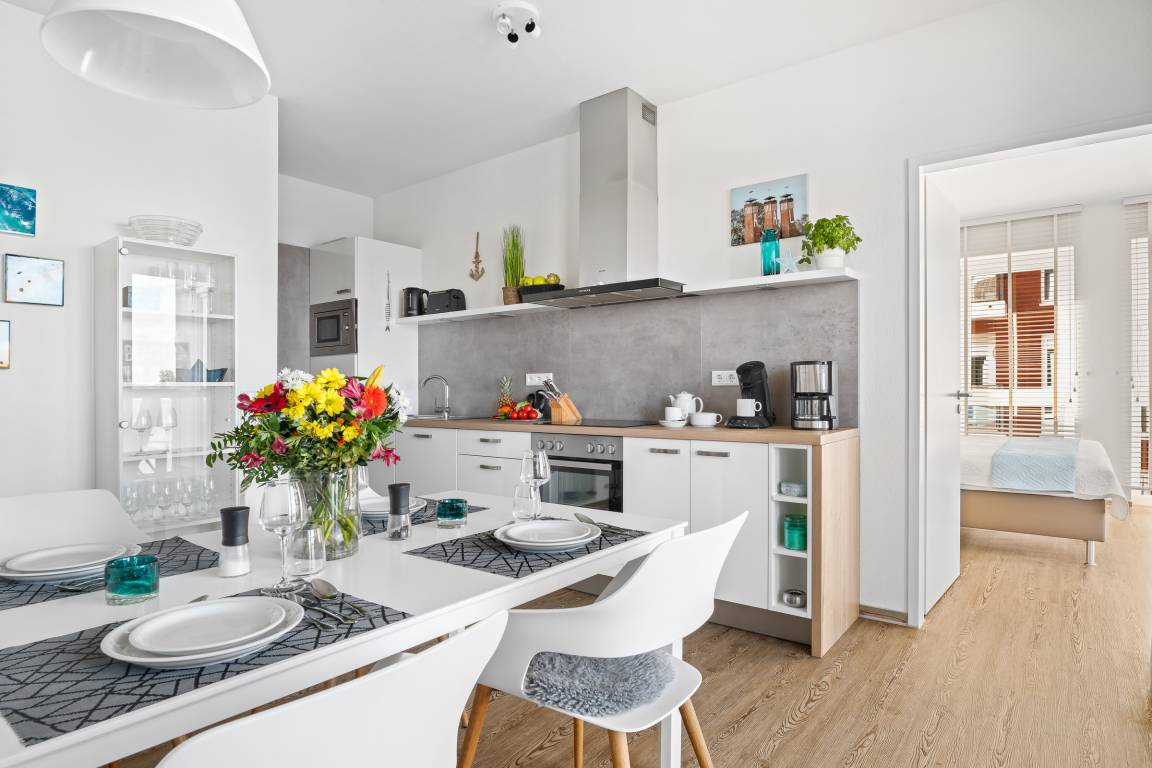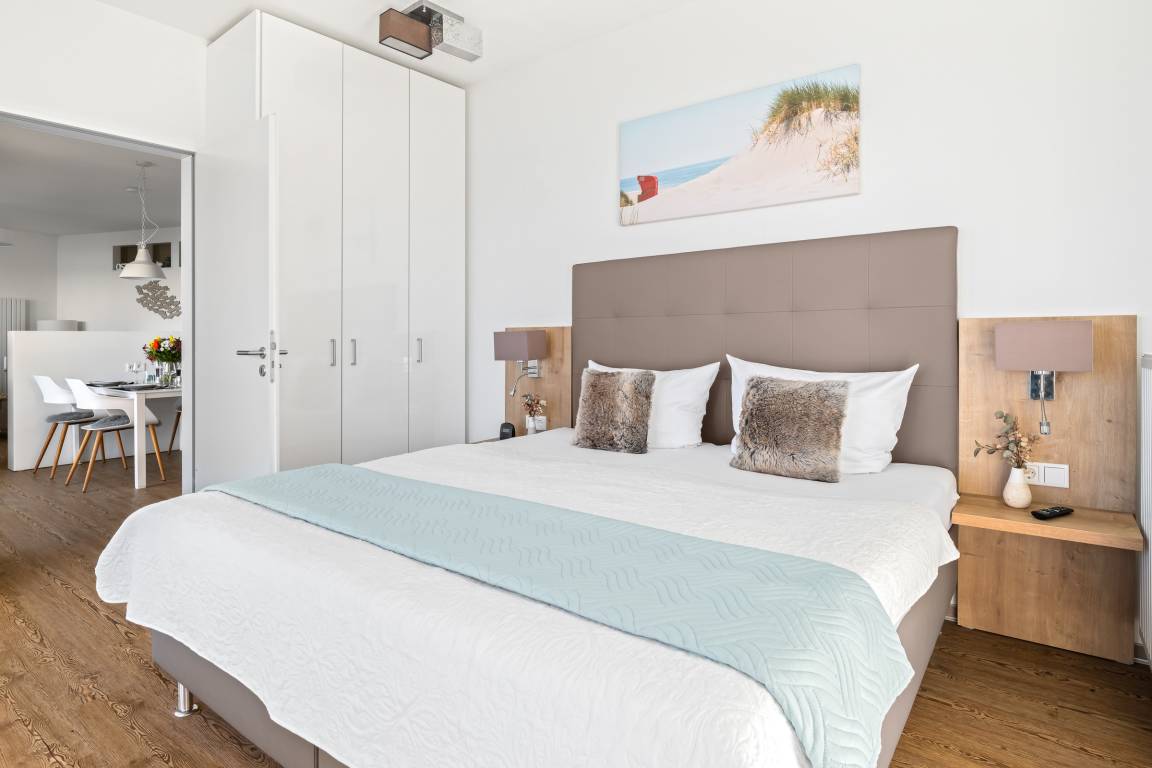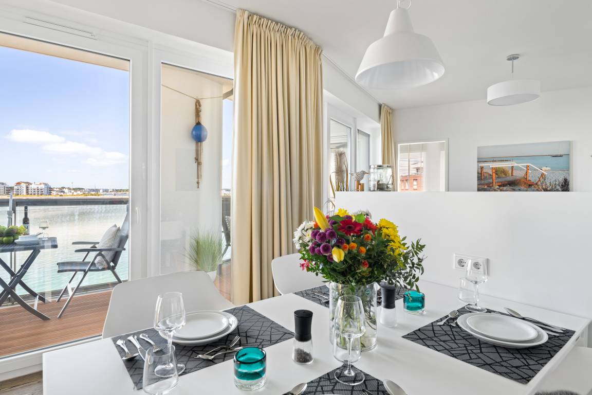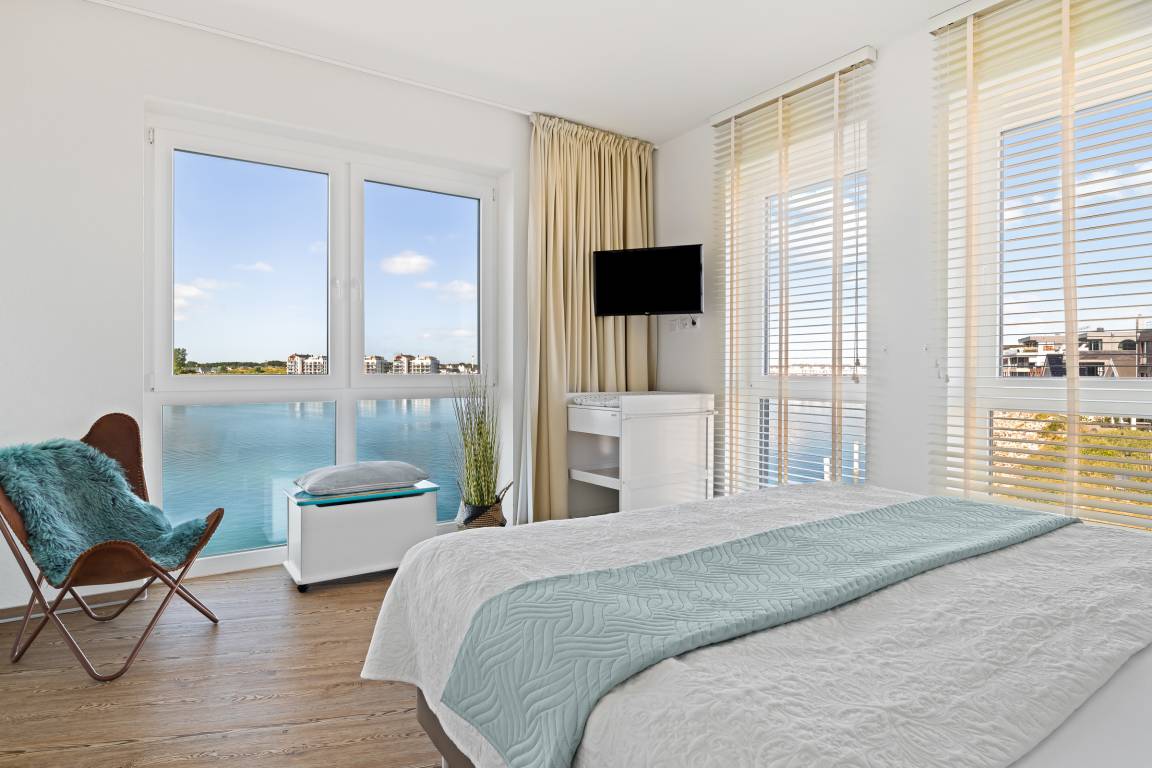 Sie werden eine umfangreiche Ausstattung mit vielen Extras vorfinden: eine Kaffeepadmaschine, eine Wickelkommode, eine Kinderspieletruhe, einen Hotelsafe und viele weitere Details. Durch die Süd-West-Ausrichtung des großen windgeschützten Balkons können Sie den Blick auf die Marina genießen. Die bodentiefen Fenster bieten auch an stürmischen Tagen eine Traumkulisse.