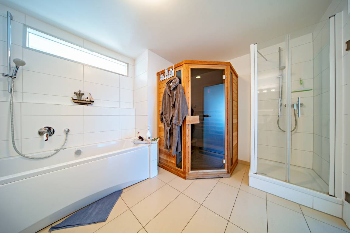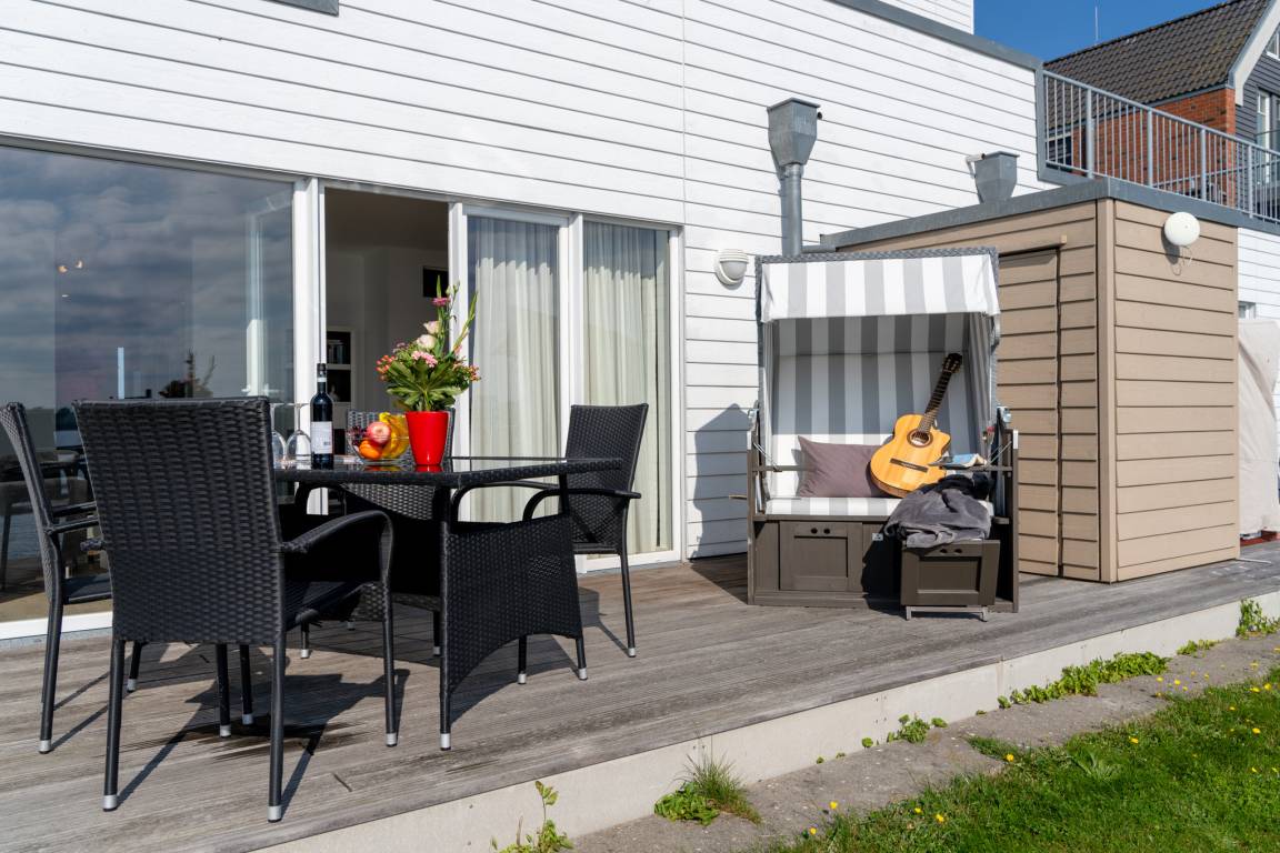 Lage direkt zwischen Hafen und Schlei, Wasserblick sowohl vom Wohnbereich als auch von den beiden Schlafzimmern, sonnige Südwest-Terrasse, eigene Infrarot-SAUNA und Badewanne mit Whirlpool.