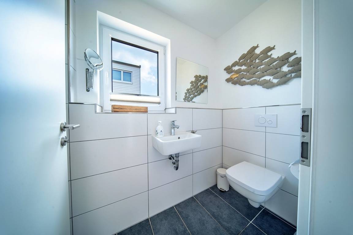 Im Obergeschoss des Ferienhauses finden Sie zwei Schlafzimmer vor, die zum Träumen einladen. Der Masterbedroom verwöhnt Sie mit einem komfortablen Doppelbett und einem atemberaubenden, direkten Wasserblick. Eine Deckenlampe mit Bluetoothfunktion versorgt unsere Gäste mit Musik. Das zweite Schlafzimmer verfügt über zwei Einzelbetten, die bei Bedarf auch zu einem Doppelbett umfunktioniert werden können, sowie ein hochwertiges Schrankbett. Ein Rausfallschutz für die kleinen Ostseeurlauber steht zur Verfügung.