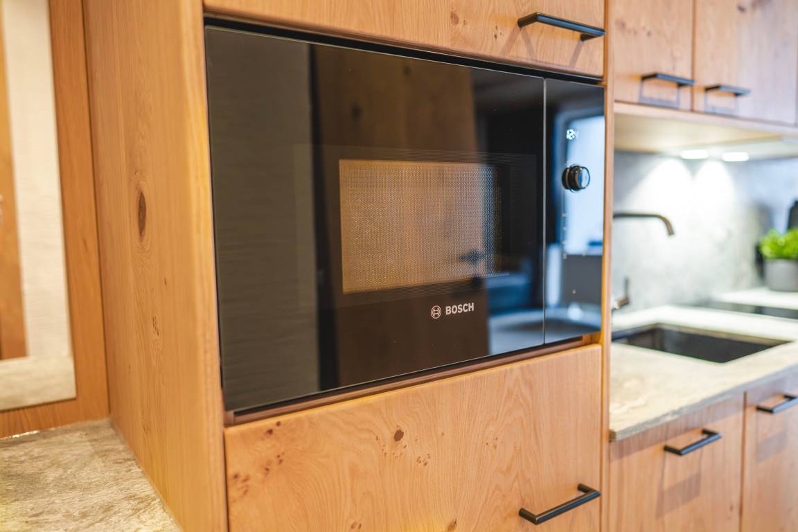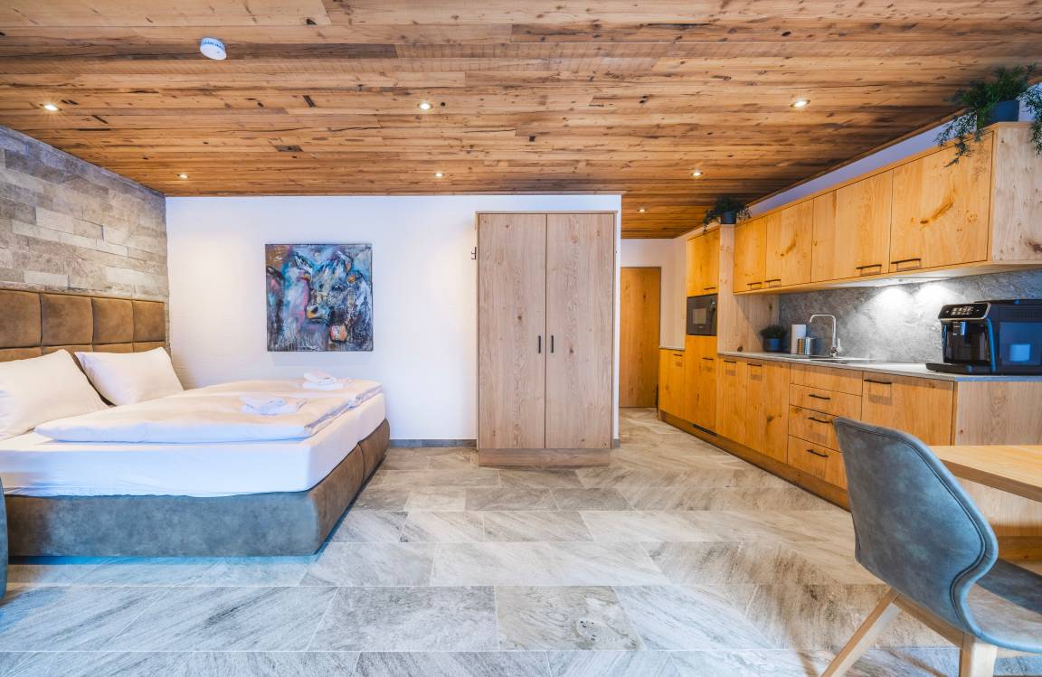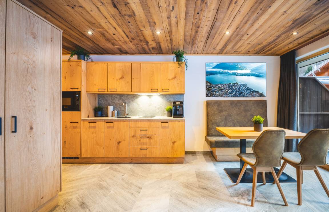 Diese gemütliche Ferienwohnung im alpinen Stil bietet eine warme und einladende Atmosphäre für Ihren Aufenthalt. Der Wohnbereich ist geprägt von natürlichen Holzelementen, die für ein rustikales und gleichzeitig charmantes Ambiente sorgen. Eine Sitzecke mit Eckbank und Esstisch lädt zu gemeinsamen Mahlzeiten oder gemütlichen Abenden ein. Der Raum ist mit hochwertigen Holzmöbeln ausgestattet, darunter eine praktische Küchenzeile, ein Fernsehbereich. Die großen Fenster mit traditionellen Vorhängen sorgen für viel Tageslicht und bieten Zugang zu einem Balkon mit Blick auf die Umgebung. Ein dekorativer Kuhfell-Teppich verleiht dem Raum zusätzlichen alpinen Charme. Hier erleben Sie eine perfekte Mischung aus Tradition und Komfort, ideal für einen erholsamen Urlaub in den Bergen.