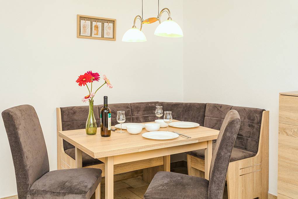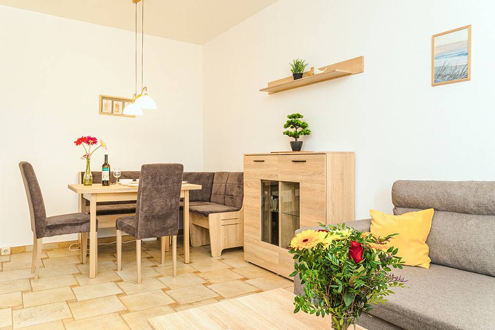 Nebenkosten Endreinigung 90 € (wird bei Buchung erhoben). Kurtaxe. Bettwäsche, Handtücher leihbar 20 €/Pers (Bestellung, wird bei Buchung erhoben). Zusätzliche Leistungen Kostenloser Internetzugang über W-Lan. 1 Pkw-Stellplatz im Preis inklusive. Kinder Babybett/Hochstuhl zusätzlich zur maximalen Personenzahl, jeweils ohne Berechnung. Haustier 50 €/Aufenthalt, max. 2 Hunde (Anmeldung).Räume & Aufteilung