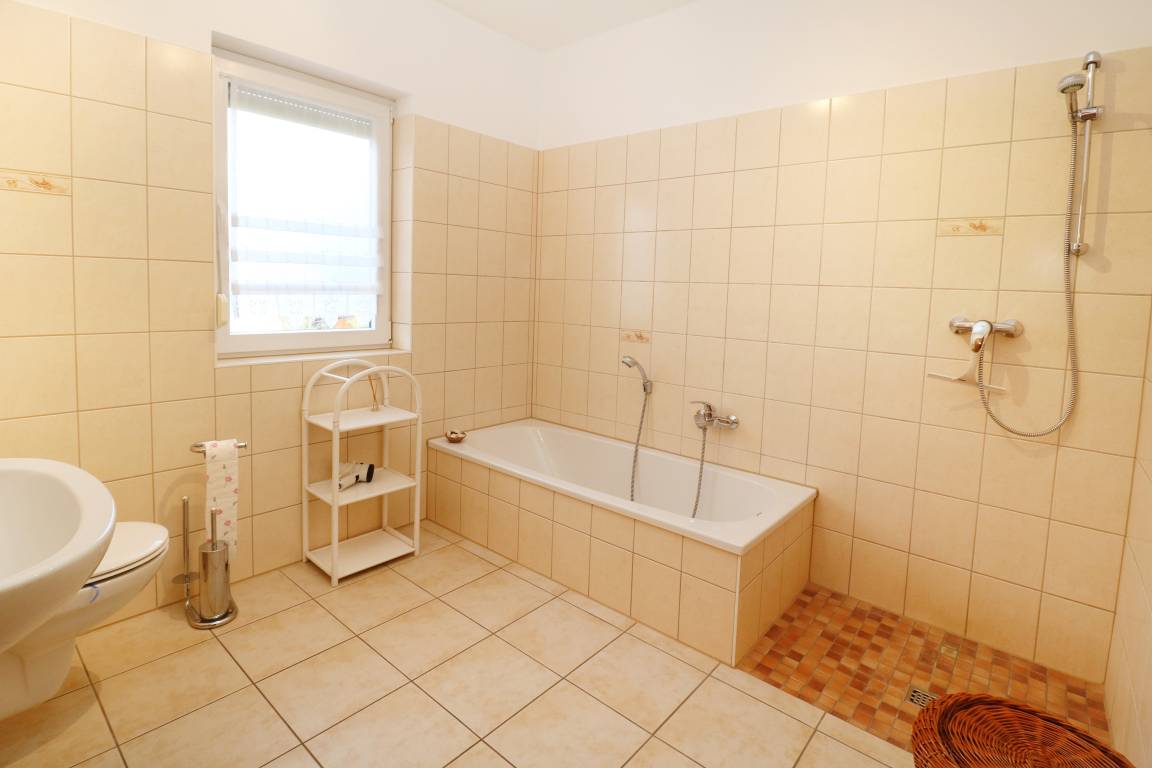 - Komfortabel ausgestattet mit Badewanne, ebenerdiger Dusche, Spiegel, Regal, Handtuchwärmer und WC