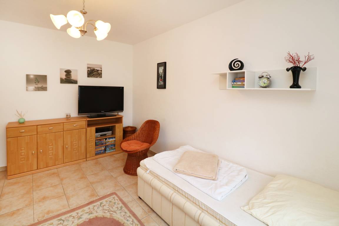 Ein Schlafzimmer ist mit einem Doppelbett (180x200 cm) und Kleiderschrank ausgestattet. Ein Babybett kann beigestellt werden. Das zweite Schlafzimmer ist mit 2 Einzelbetten (90x200 cm), Kommode und Flachbild-TV eingerichtet.