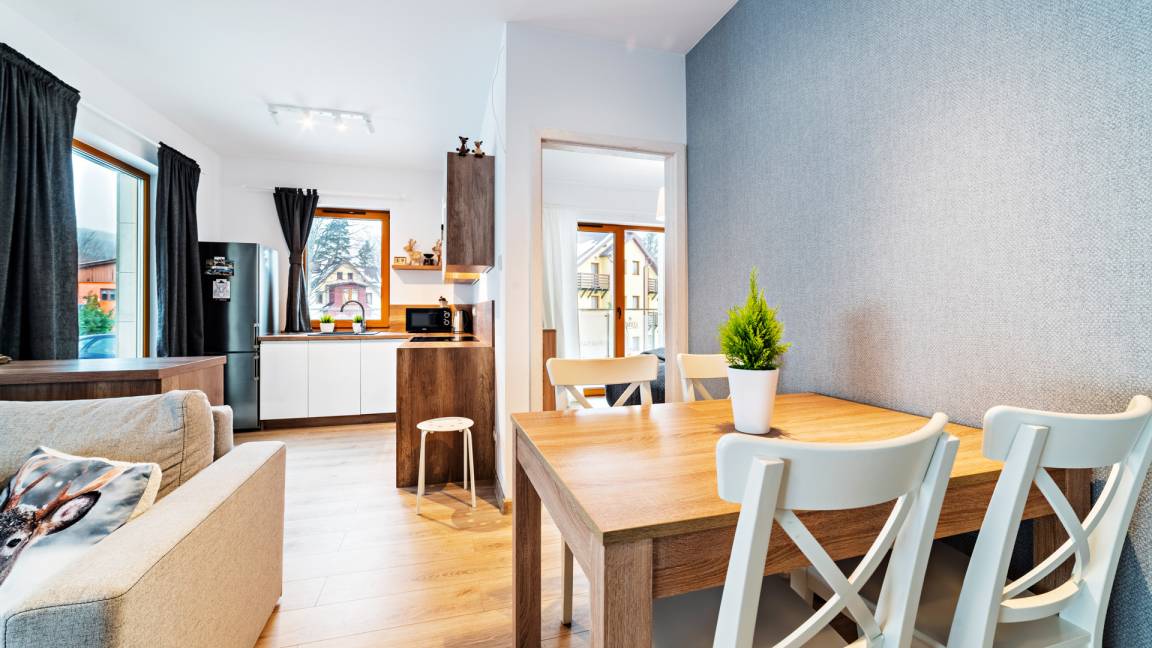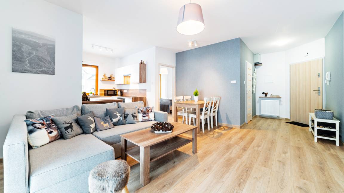 Hunde sind in ausgewählten Apartments willkommen. Der Aufpreis für die Unterbringung eines Haustieres beträgt 100 PLN (einmalige Gebühr). Gäste, die mit einem Hund übernachten möchten, werden gebeten, sich vorab telefonisch an die Mitarbeiter des örtlichen Büros in Karpacz zu wenden (die Telefonnummer finden Sie auf unserer Website im Reiter KONTAKT).