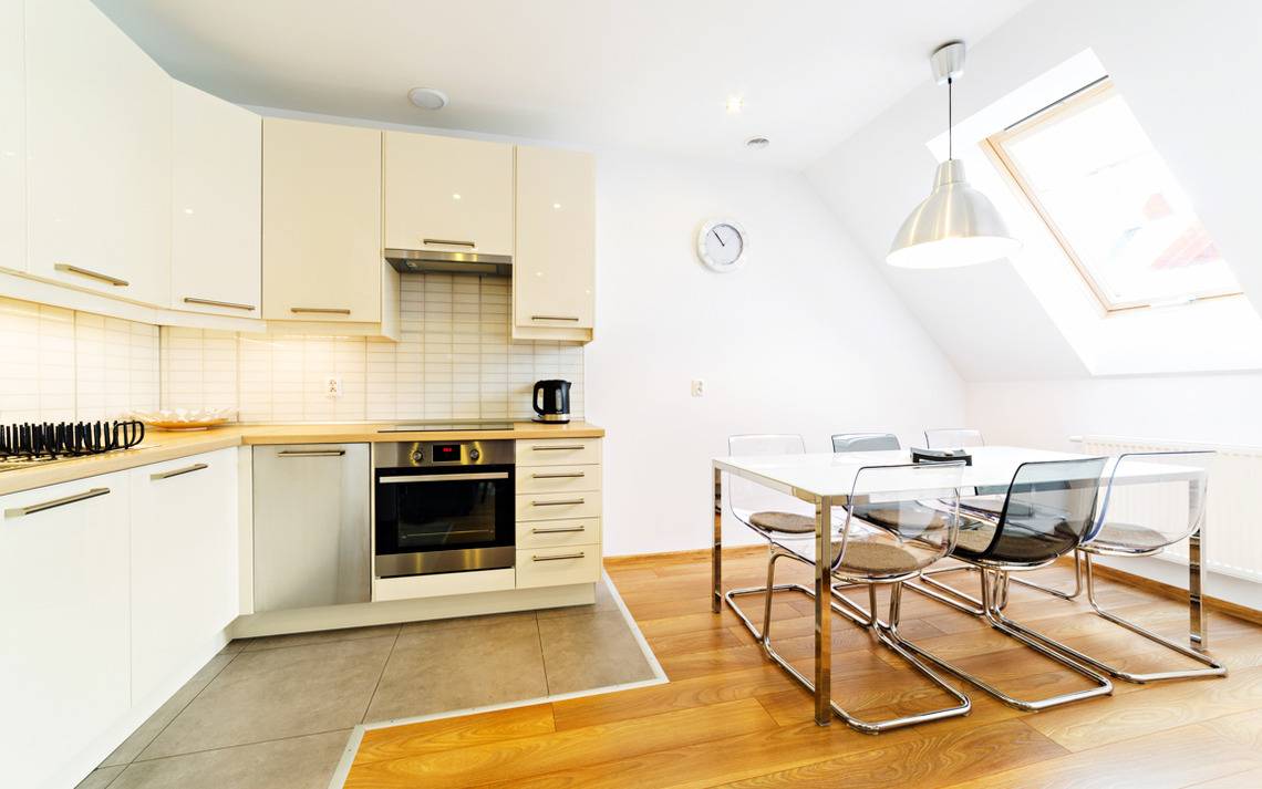 Jede Wohnung verfügt über eine voll ausgestattete Küchenzeile und einen Kamin (Holz wird nicht gestellt).