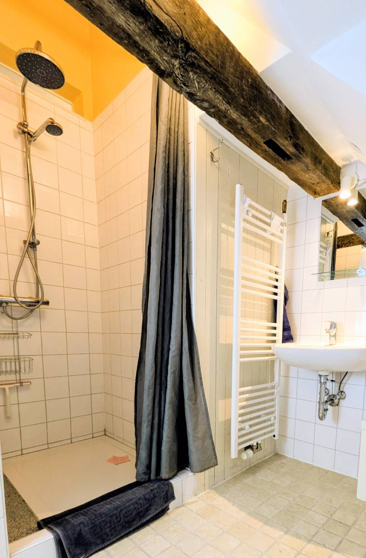 Bad & Wellness: Modernes Badezimmer mit großzügiger Walk-in-Dusche und WC. Ein separater Flur dient als eleganter An- und Umkleidebereich.
