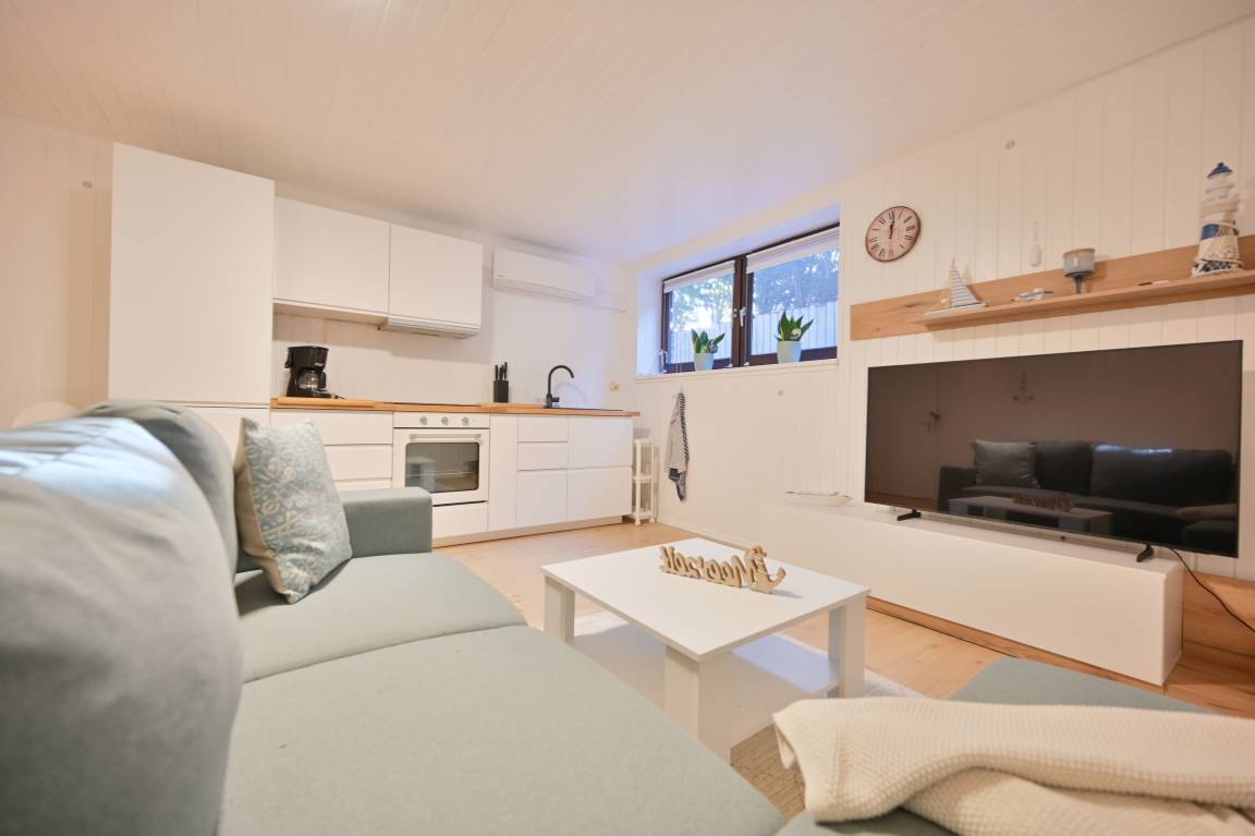 Die Wohnung verfügt über eine moderne Küchenzeile, ein komfortables 180 cm Doppelbett, eine Schlafcouch, Smart-TV sowie WLAN. Besonders familienfreundlich ist die kinderfreundliche Ausstattung mit Babybett, Hochstuhl und Gesellschaftsspielen. Für jede Jahreszeit bestens gerüstet: Eine Klimaanlage sorgt im Sommer für angenehme Kühle, während die Heizung im Winter schnell Wärme und gemütliche Abende schafft.