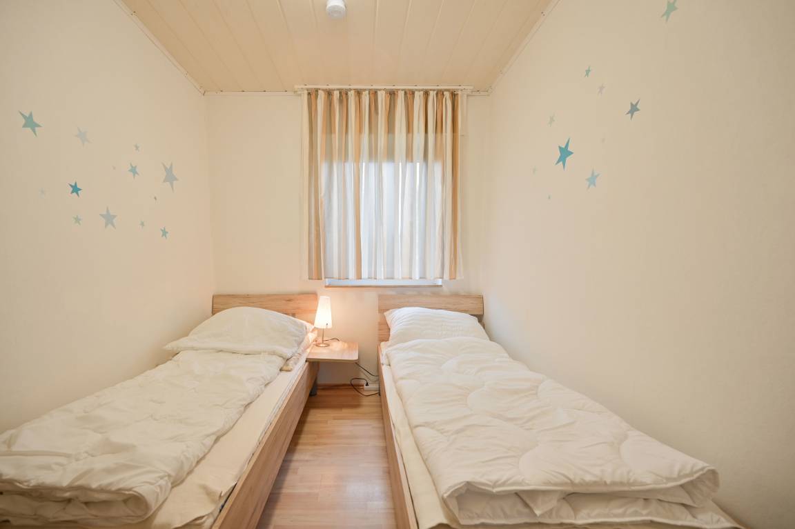 Im Kinderzimmer befinden sich zwei Einzelbetten mit einem Anhängetisch und einem Regalschrank für Kleidung oder Spielzeug. Auf Anfrage können Sie ein kostenloses Kindereisebett erhalten.
