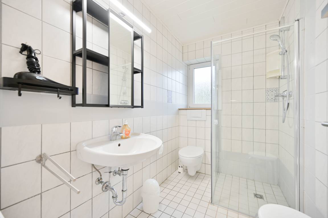 Das Badezimmer besteht aus einem WC, einem Waschbecken, einer Dusche, einem Spiegel, einem Fön, einem Hocker, mehreren Haken und einer Ablage.