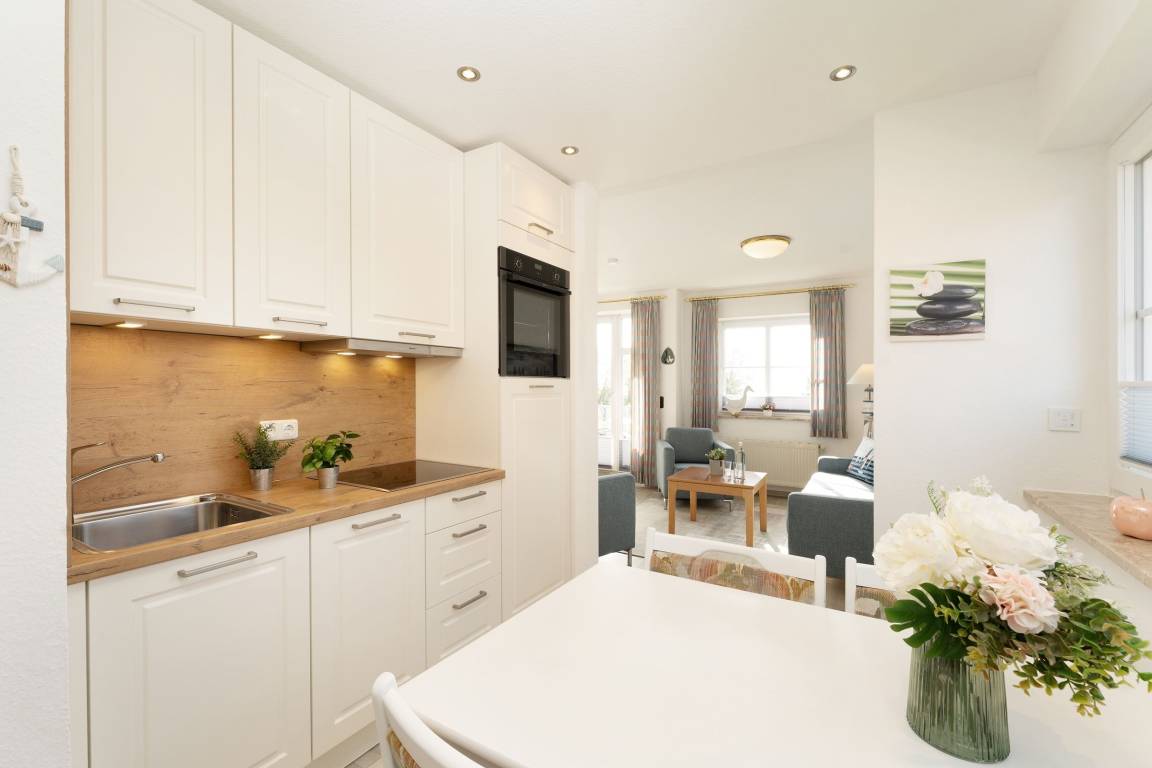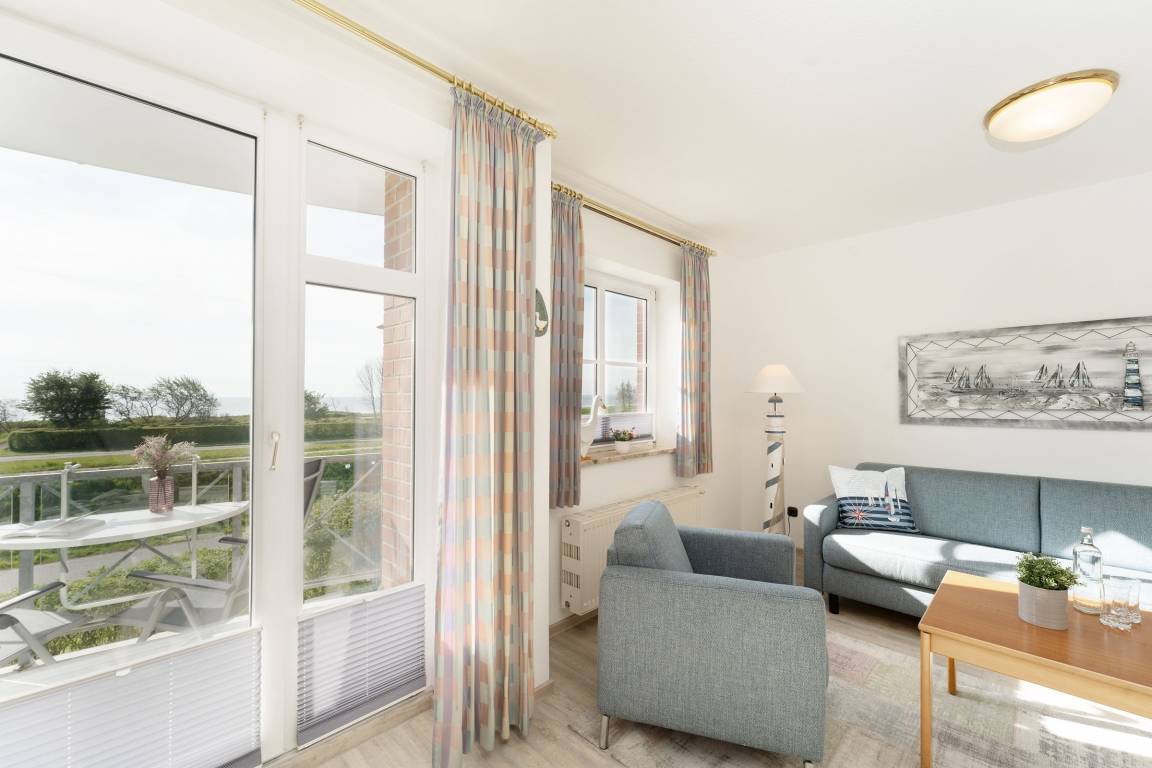 Die Ostsee im Blick, dazu eine gemütliche Einrichtung – was will man mehr? Die niedliche Wohnung Muschelschnecke im gepflegten Ferien-Wohnpark Kaiserhof bietet Ihnen Meerblick, Strandnähe und eine gute Ausstattung zum Wohlfühlen. Nehmen Sie Platz auf dem gemütlichen Sofa oder den beiden Sesseln. Genießen Sie hier das TV-Programm – oder aber die Fernsicht. Gleich hier haben Sie Zutritt auf den möblierten Balkon, der Ihnen ein wundervolles Panorama bietet. Genießen Sie hier Ihre Auszeit, dazu ein gutes Buch und etwas Obst. Die helle Küchenzeile sowie einen gemütlichen Ess-Platz finden Sie im Wohnbereich, gleich um die Ecke. Zaubern Sie hier nach Lust und Laune Ihre Lieblingsmenüs. Nach einem schönen Tag am Strand haben Sie die Wahl: Zum einen lässt sich die Couch im Wohnzimmer in ein komfortables Doppelbett (ca. 160x200 cm) verwandeln. Oder Sie ziehen sich ins Schlafzimmer zurück, dort steht ein gemütliches Doppelbett (2x 80x200 cm). Das hell geflieste Bad ist mit einem beleuchteten Spiegel ausgestattet und verspricht einen guten Start in den Tag.