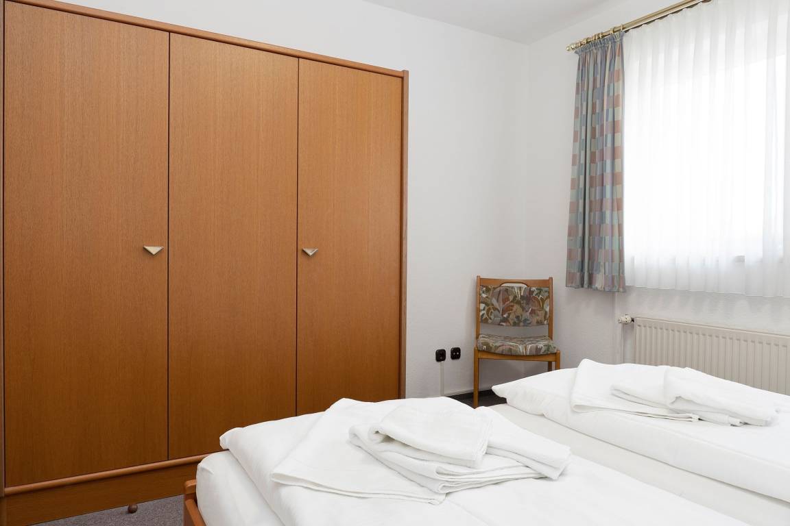 Schlafzimmer: 1 Doppelbett (2x 80x200 cm), Kleiderschrank, Außenrollläden
