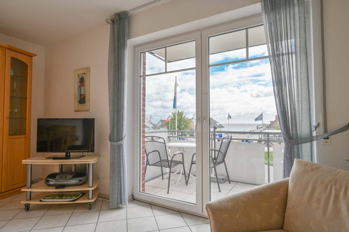 Dem Wohnbereich ist der Meerblick-Balkon angeschlossen.