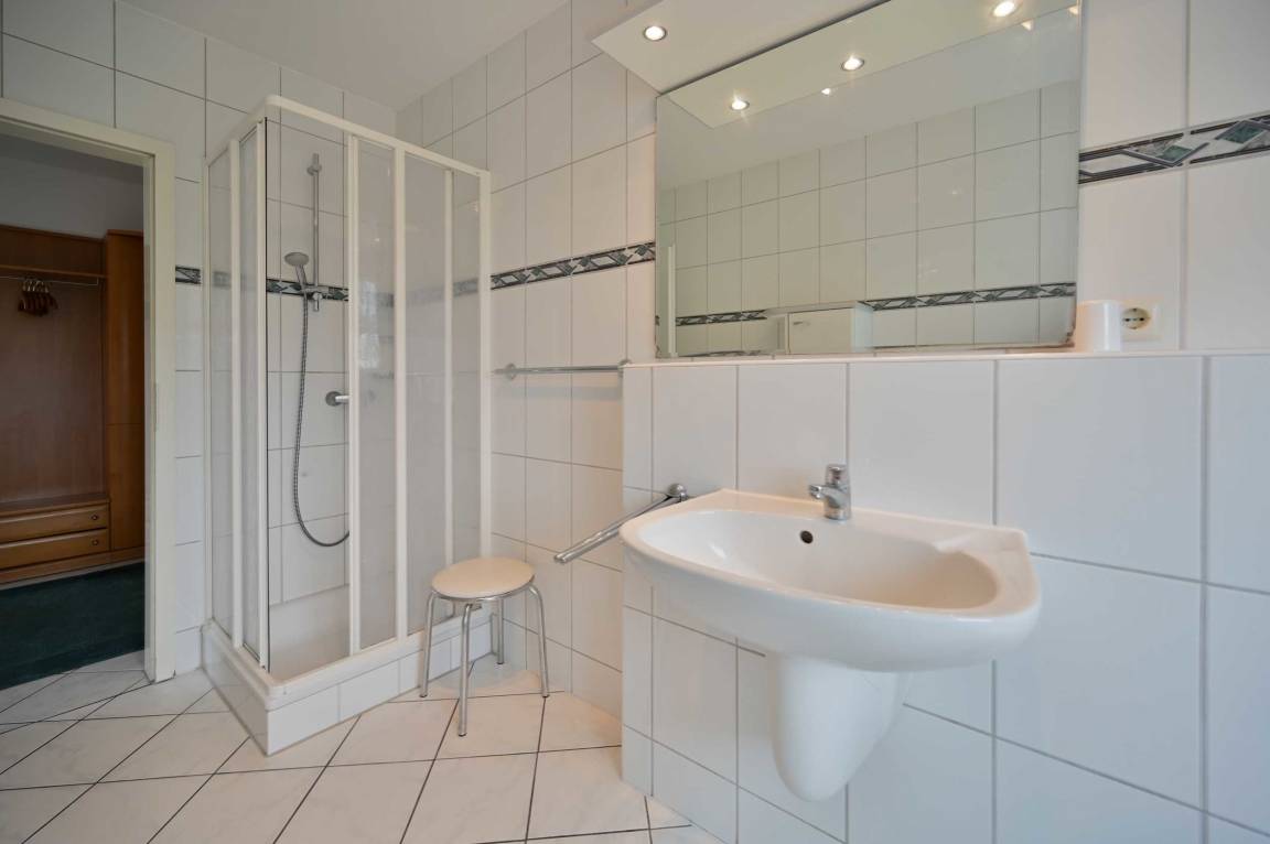 Das Badezimmer ist mit Außenfenster, Dusche, WC und Waschtisch ausgestattet.