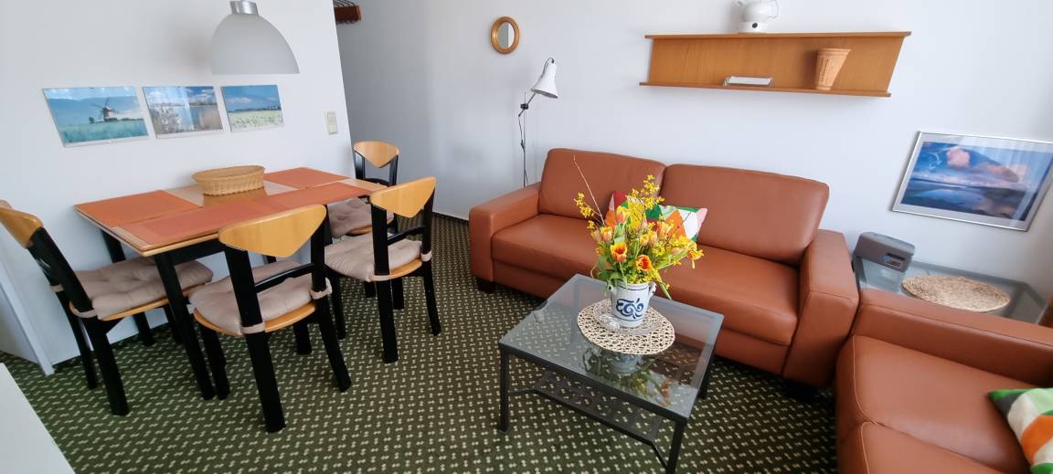 Wohnzimmer, Schlafzimmer mit Doppelbett 1,60 m breit, Kinderzimmer mit zwei Einzelbetten und kleines Kinderbett, Duschbad. Küche mit Kühlschrank mit Gefrierfach, 4-Platten-Herd mit Backofen, Bad. Auf Wunsch stellen wir Ihnen eine Mikrowelle, Kinderbett und Hochstuhl unentgeltlich zur Verfügung. Waschmaschine und Trockner im Waschraum werden über einen Münzautomaten abgerechnet. Über WLAN haben Sie kostenlosen Internetzugang. Unseren Garten können Sie zum Spielen, Grillen und Entspannen nutzen, Sandkasten und Schaukelgerät, Liegestühle und sonstige Gartenmöbel stehen Ihnen zur Verfügung.Ein Haustier (Hund) ist in der Nebensaison erlaubt.