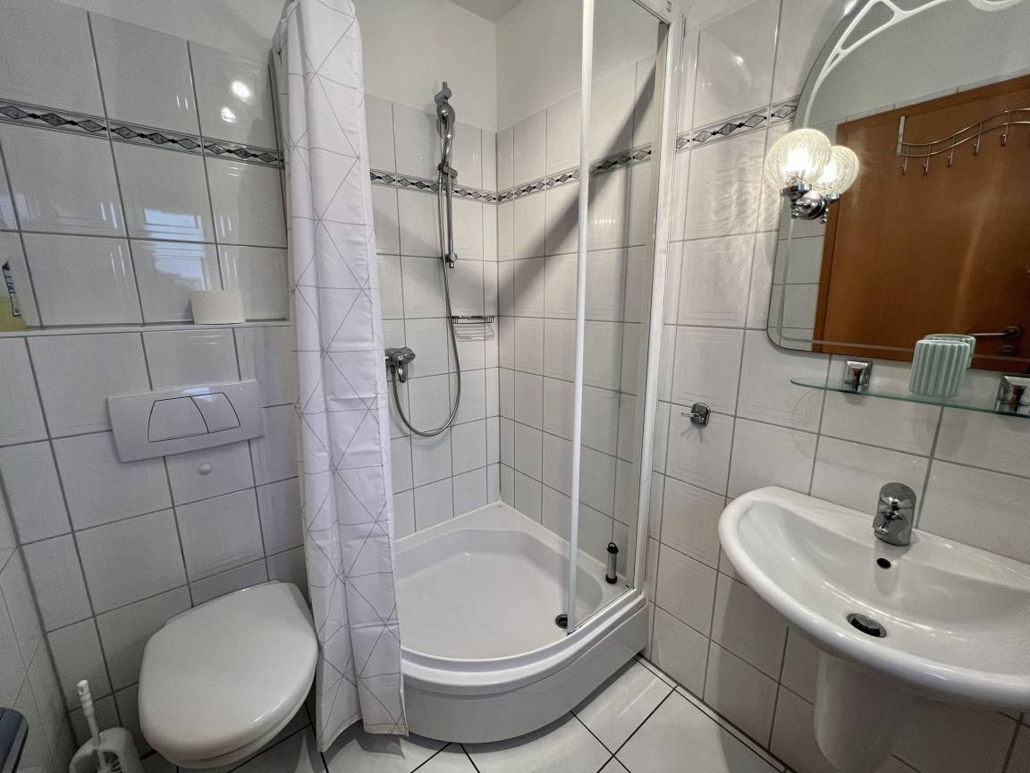 Die Doppelhaushälfte erstreckt sich über zwei Etagen und bietet Platz für maximal 4 Personen. Im Erdgeschoss befinden sich der Eingangsbereich mit Garderobe, ein lichtdurchflutetes Wohn- und Esszimmer mit Sitzecke und TV, sowie eine offene, voll ausgestattete Küche mit Geschirrspüler und Essplatz. Ein Badezimmer mit Dusche und WC rundet das Erdgeschoss ab.