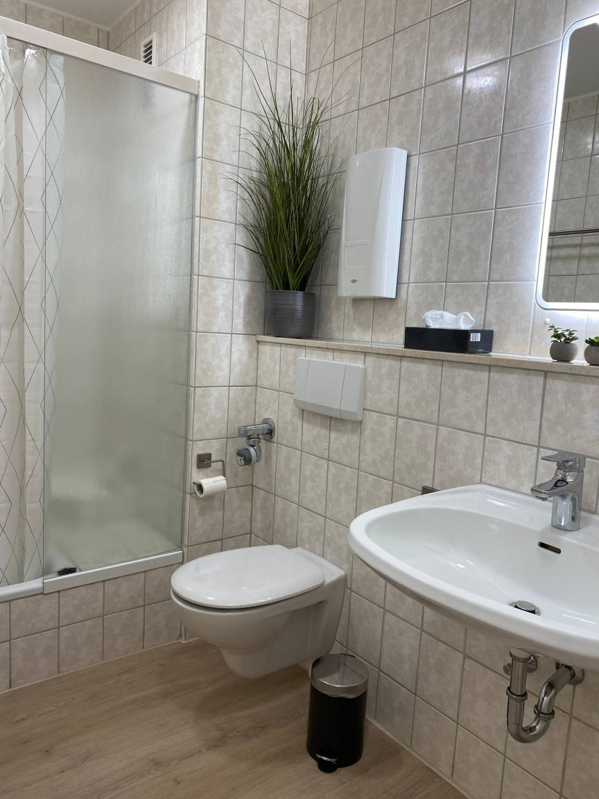 Die Wohnung ist mit einem Dusch- und WC ausgestattet. Dieses bietet eine großzügige Wannen-Dusche und viel Platz für Ihre mitgebrachten Kosmetikartikel.