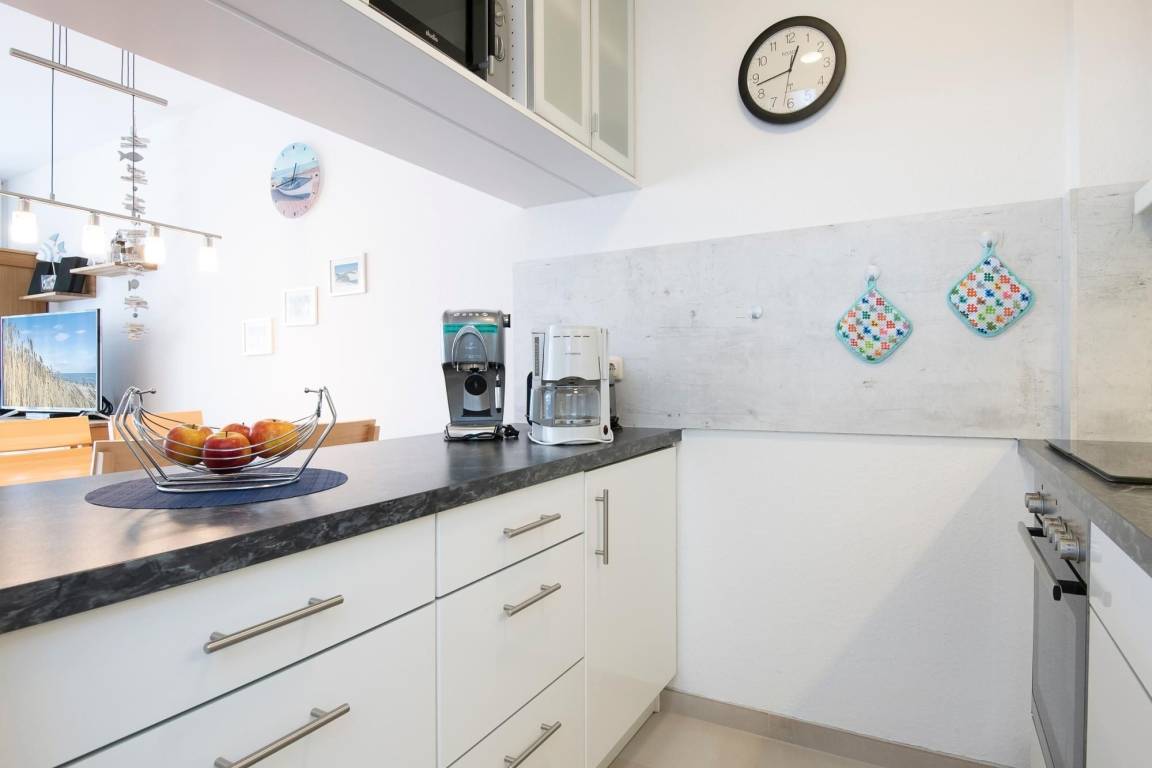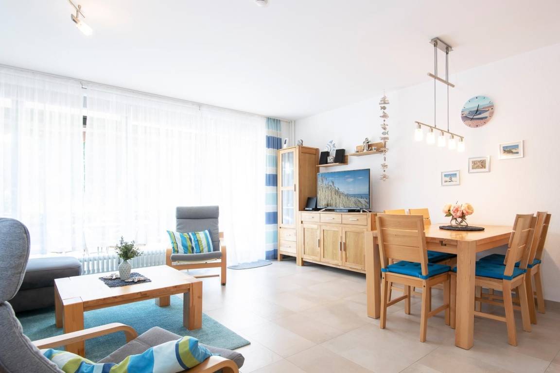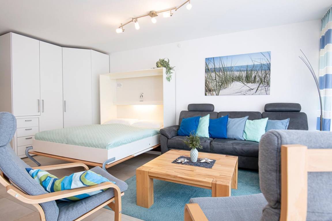 Zwischen Wald, Strand und Meer erwartet Sie diese gemütlich und anspruchsvoll eingerichtete Ferienwohnung. Das großzügiges Wohnzimmer mit integriertem Essbereich bildet den Mittelpunkt Ihrer Ferienwohnung. Verbringen Sie hier entspannte Stunden auf dem Ecksofa oder genießen Sie leckere Mahlzeiten. Diese können Sie in der offenen, modernen Einbauküche mit allen Annehmlichkeiten wie z. B. Geschirrspüler, Backofen, Mikrowelle und Ceranfeld zubereiten. Außerdem lässt sich dieser Raum im Handumdrehen durch die Schrankwand mit ausklappbaren Doppelbett (2x 80x200 cm) zu einem komfortablen Schlafplatz umwandeln. Von hier aus gelangen Sie auch auf den sonnigen Balkon. Dort können Sie die Ruhe genießen und Ihre Urlaubstage ausklingen lassen. Über den Flur erreichen Sie das zweite großen Schlafzimmer mit kuscheligem Einzelbett (90x190 cm) und einem französisches Bett (140x190 cm) sowie einem 2. Fernseher. Das schöne Bad verfügt über eine Dusche mit flachem Einstieg und rundet diese Wohnung damit ab.