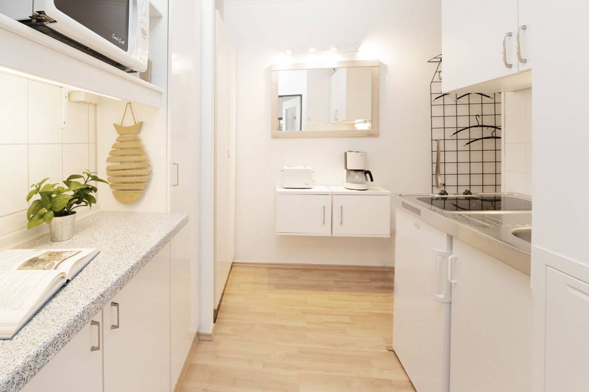 Nur 100 Meter zum Ostseestrand ... wer so nah am Meer wohnen möchte, ist in der Ferienwohnung Meerjungfrau in den Strandappartements am Leuchtturmweg genau richtig. Die Zimmer sind liebevoll eingerichtet und sorgen durch Farbakzente für gute Urlaubslaune. Entspannen Sie auf dem Sofa oder freuen Sie sich über die gute Seeluft auf dem überdachten, möblierten Balkon. Hier, oder auch am Essplatz, können Sie prima Ihre Speisen einnehmen, die offene Küche befindet sich im Flur. Im hinteren Bereich des Wohnzimmers steht ein Doppelbett (2x 90x200 cm), das durch einen Vorhang gemütlich abgeschirmt werden kann. Das Kinderzimmer ist mit einem Etagenbett (je 90x180cm) ausgestattet. Hier befindet sich auch ein Arbeitsplatz mit Sekretär, falls Sie noch etwas Arbeit dabei haben. Das gepflegte Duschbad ist innenliegend.