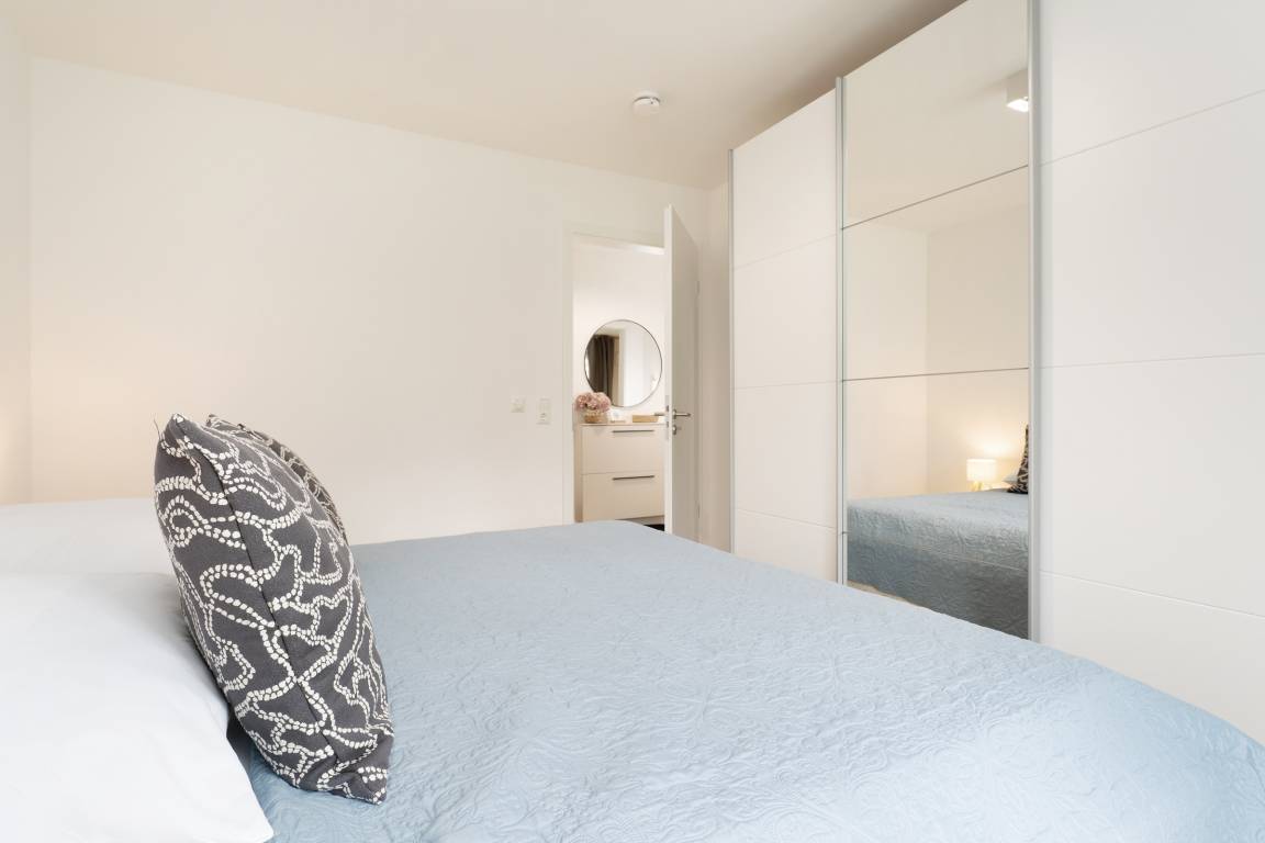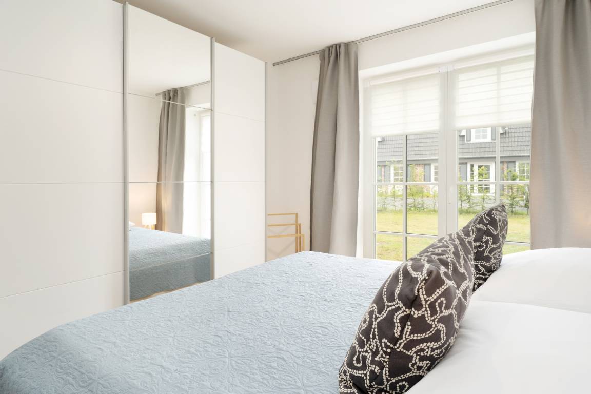 Schlafzimmer: 1 Doppelbett (2x 90x200 cm), Kleiderschrank, Verdunkelung: Verdunkelungsvorhang, Platz für ein Babybett vorhanden