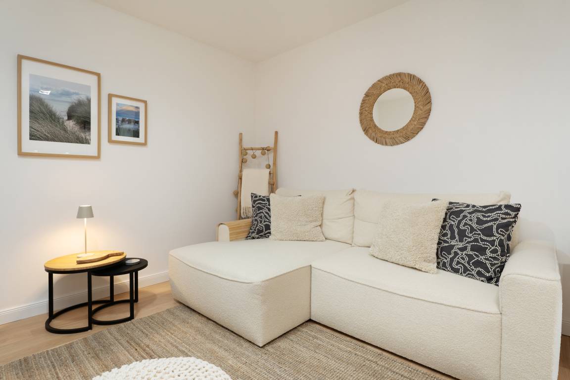 Die angrenzende Küche ist mit Geschirrspüler, Ceranfeld, Backofen, Kühlschrank, Kaffeemaschine und weiteren Annehmlichkeiten bestens ausgestattet. Das separate separate Schlafzimmer mit bequemem Doppelbett sorgt für erholsamen Schlaf. Zwei weitere Gäste finden auf dem komfortablen Schlafsofa im Wohnzimmer Platz. Im Bad erwartet Sie eine Dusche mit flachem Einstieg, WC sowie eine angenehme Fußbodenheizung.