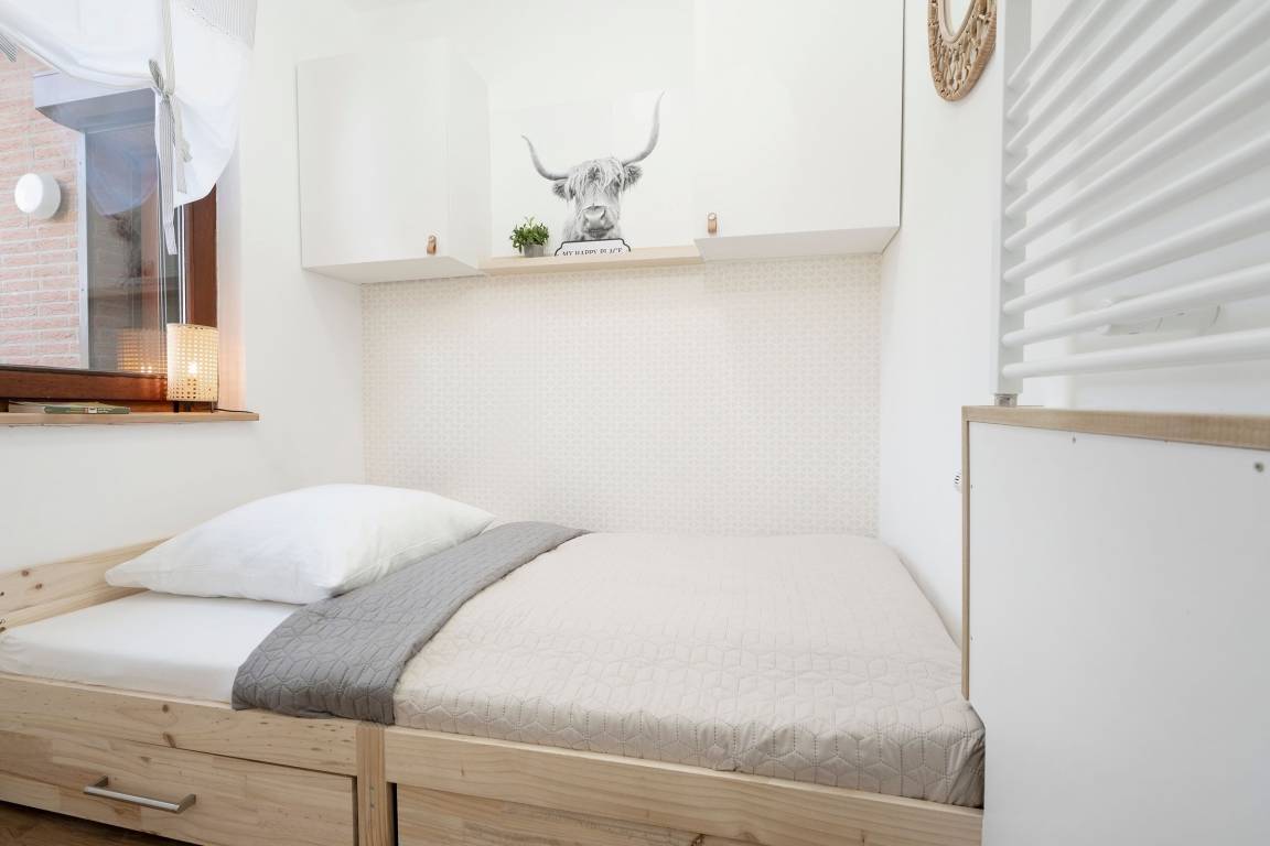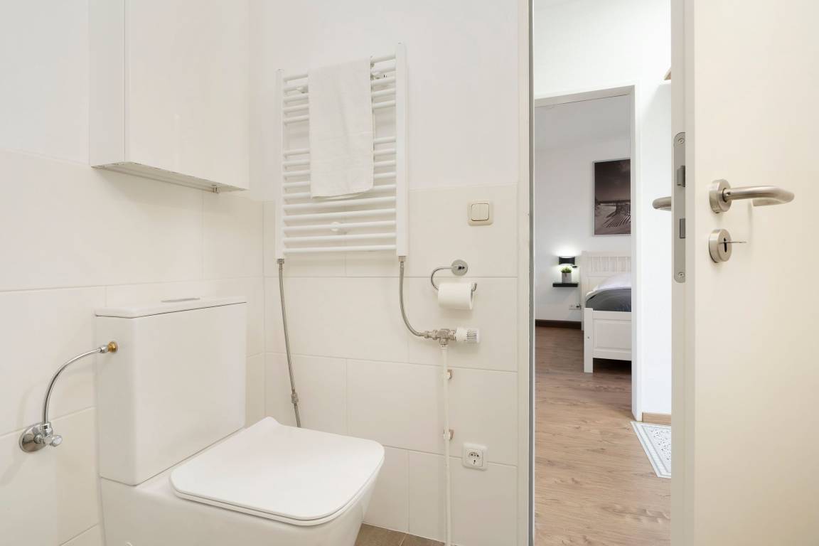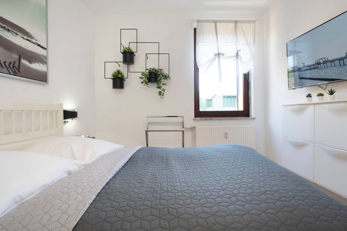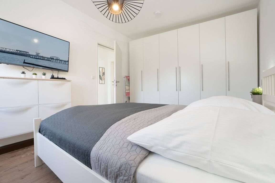 Schlafzimmer 1: Doppelbett (ca. 2x 80x200cm), TV (nur öffentliche Sender + Smart TV), Kleiderschrank, Verdunkelung (Außenrollläden), Platz für Babybett vorhanden